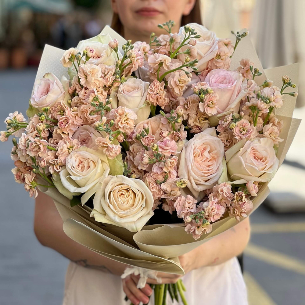 - Як замовити Вишуканий дует запашної півонієподібної троянди White O’Hara та кущової матіоли «Абрикосовий аромат»? ❯
