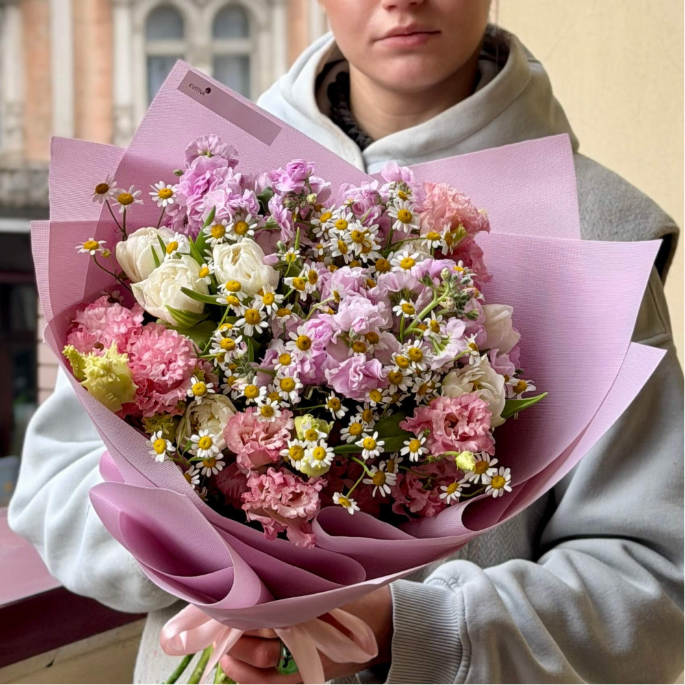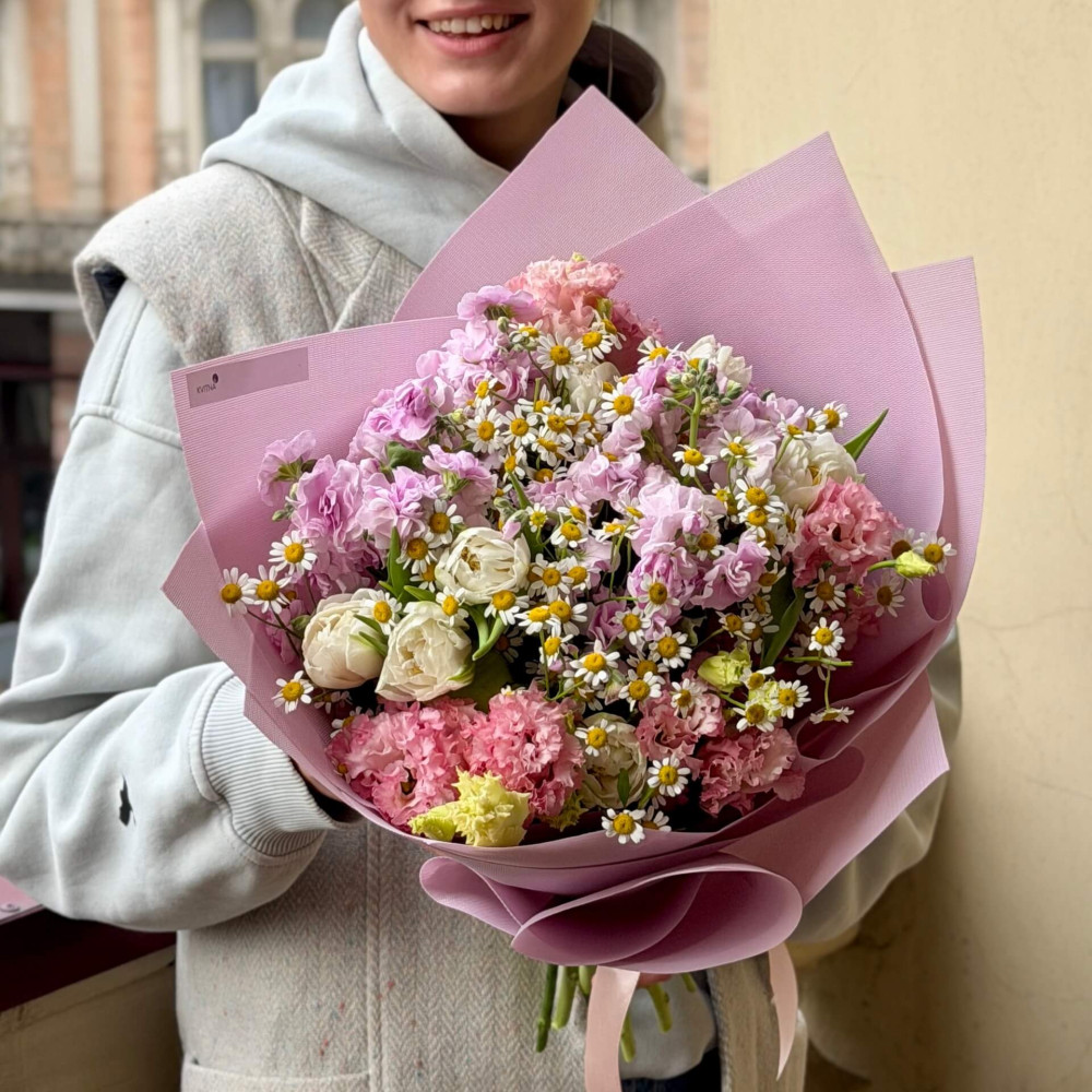 - Як замовити Витончений польовий букет із кущовою матіолою та танацетумом «Ніжна квітка моя»? ❯