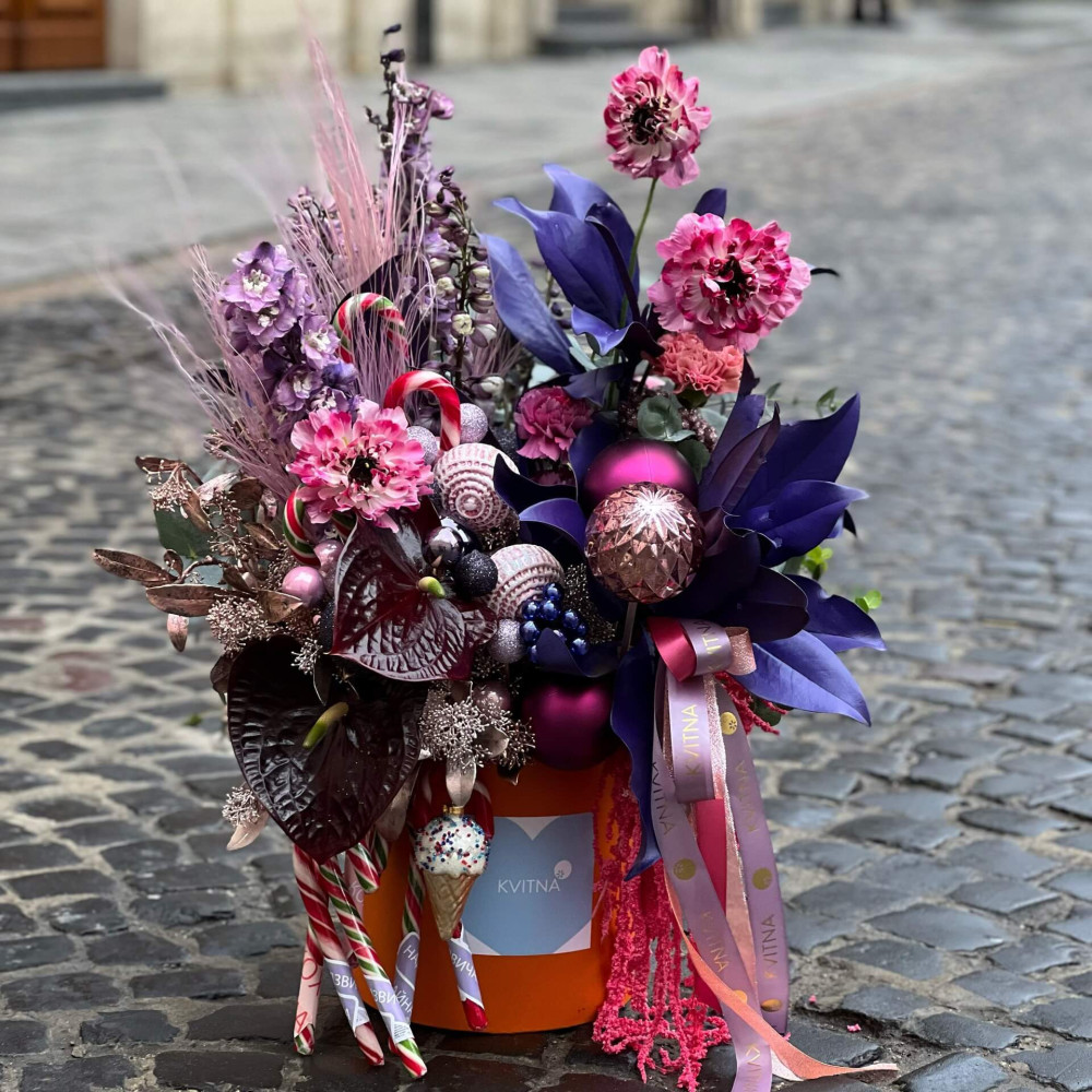 Нехай композиція (коробка, кошик, сніп) з квітами від Квітна тішить Вас якнайдовше!