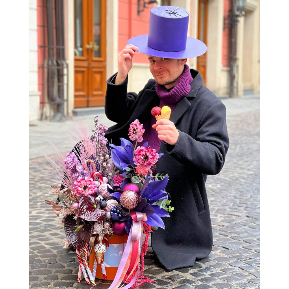 Цукерки – то ласощі для тіла, а квіти – ласощі для душі та емоцій. Яскрава, солодка композиція перенесе тебе в світ приємних сюрпризів і кумедних несподіванок, а різноманітний склад – від дельфініуму і чудових ранункулюсів до магнолії та антуріума хочеться довго розглядати: незабутні емоції гарантовані.