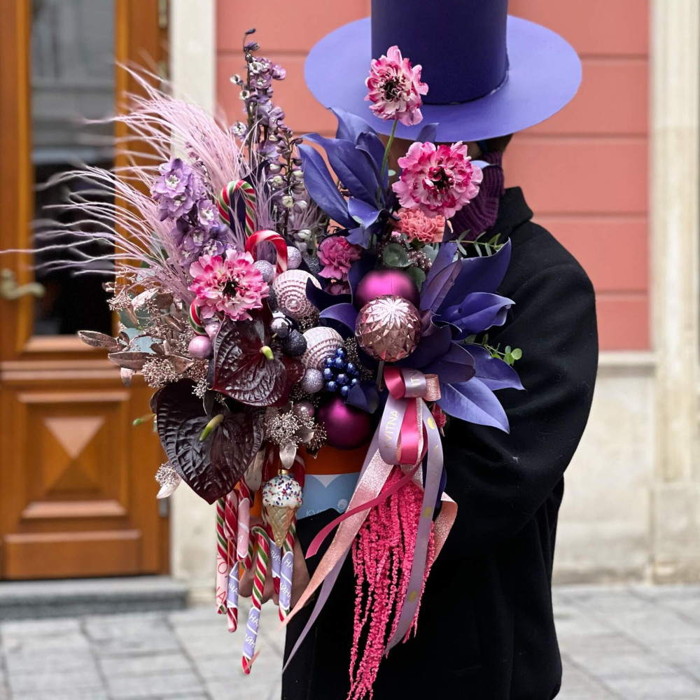 Квіти: Ранункулюс японський, Дельфініум, Антуріум, Діантус (Гвоздика), Скімія, Магнолія, Ерінгіум, Стіфа, Евкаліпт, Декор, Солодощі