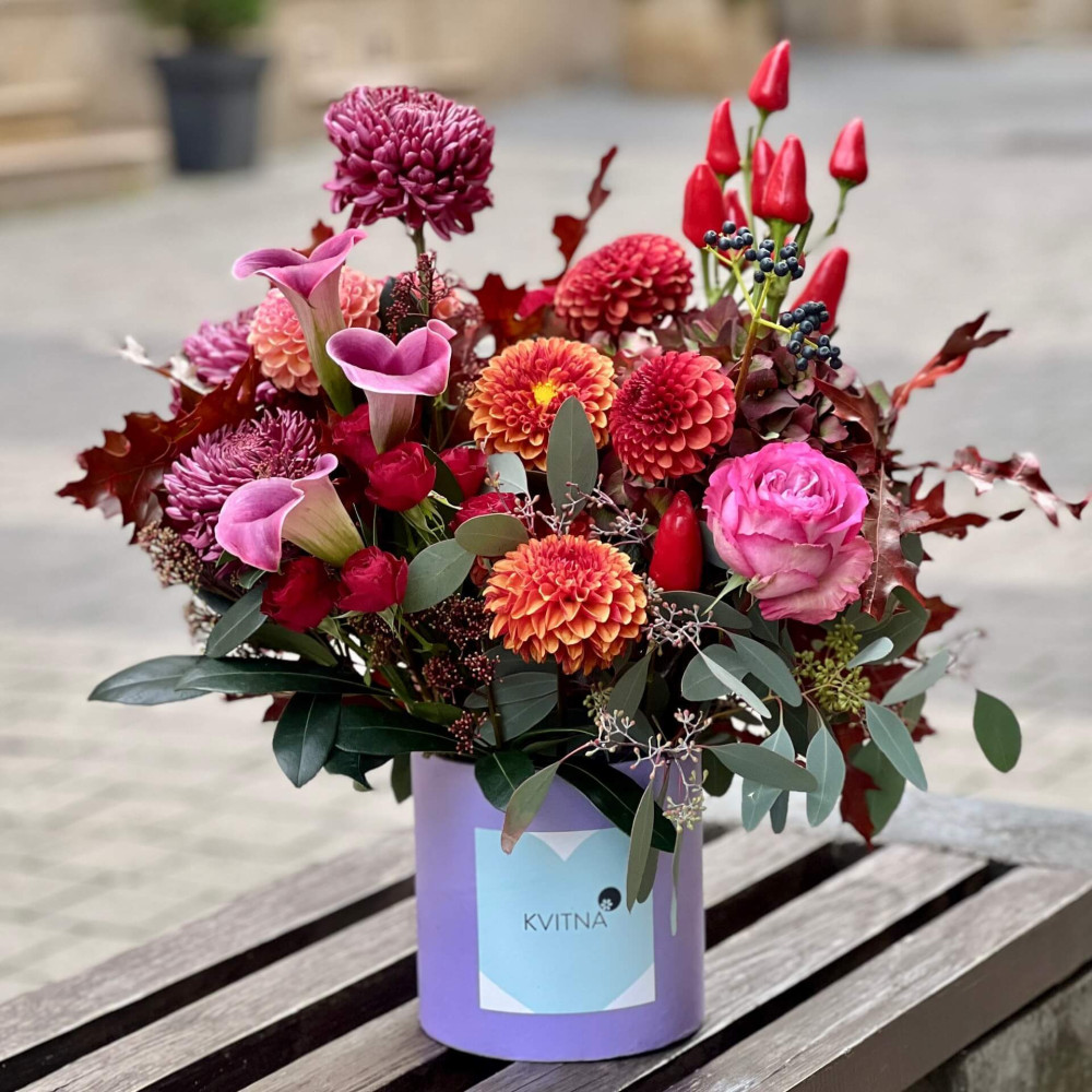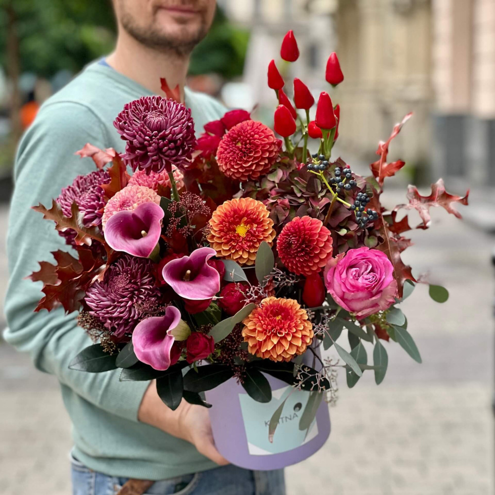 Нехай композиція (коробка, кошик, сніп) з квітами від Квітна тішить Вас якнайдовше!