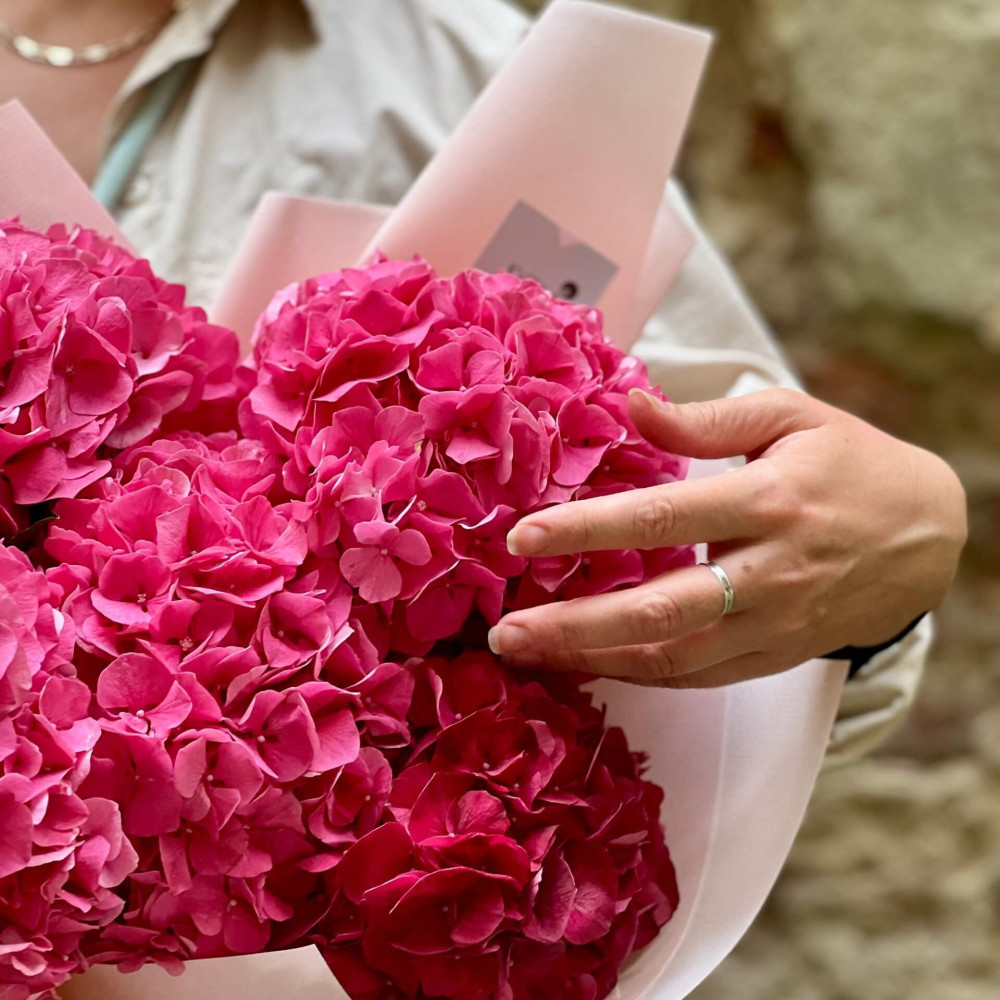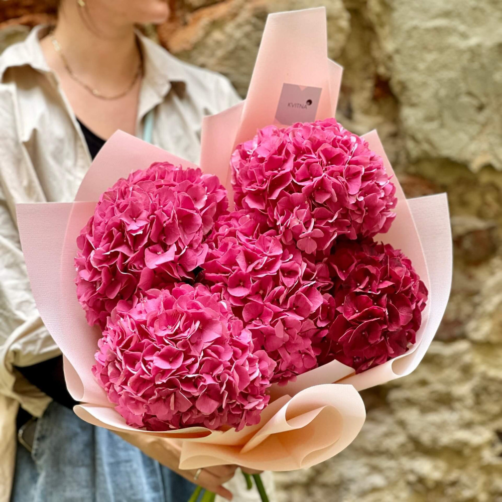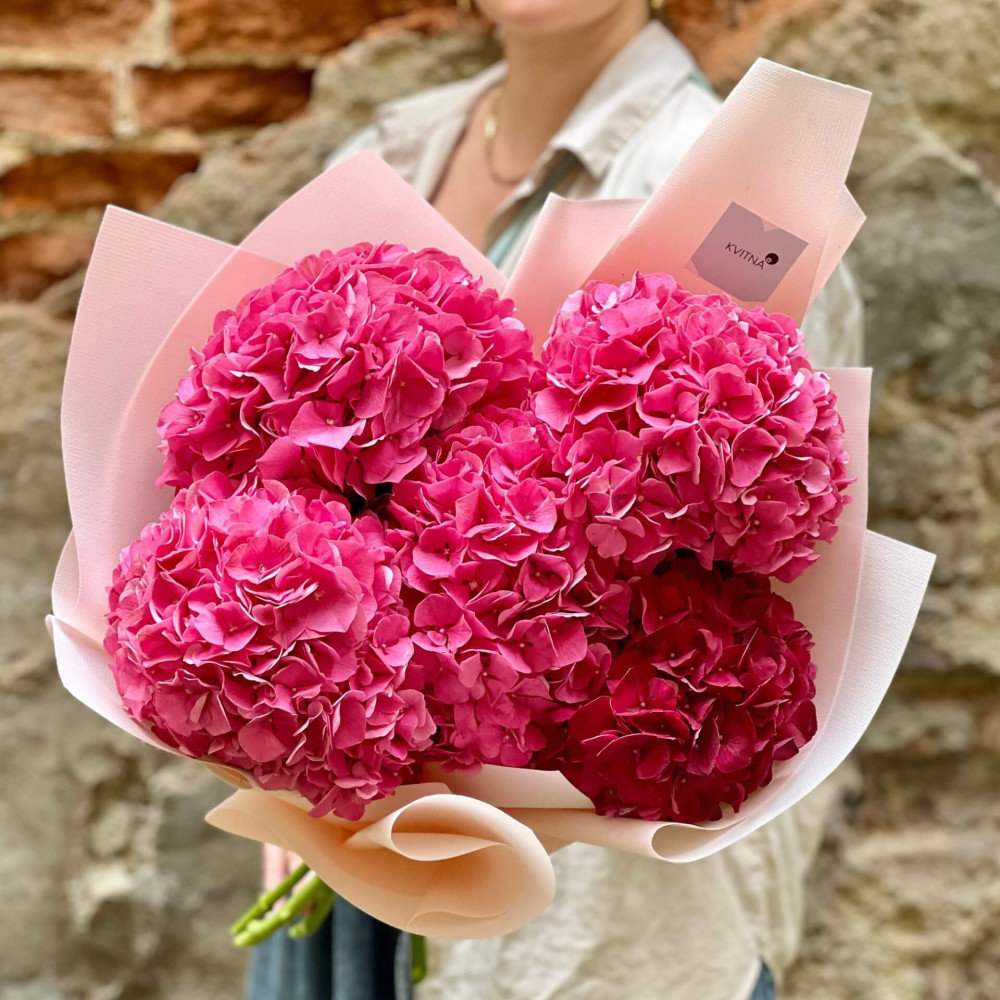 - Як замовити Яскравий букет із 5 гортензій «Малинка»? ❯