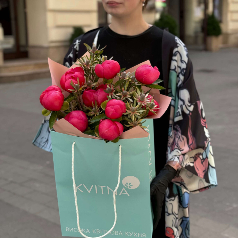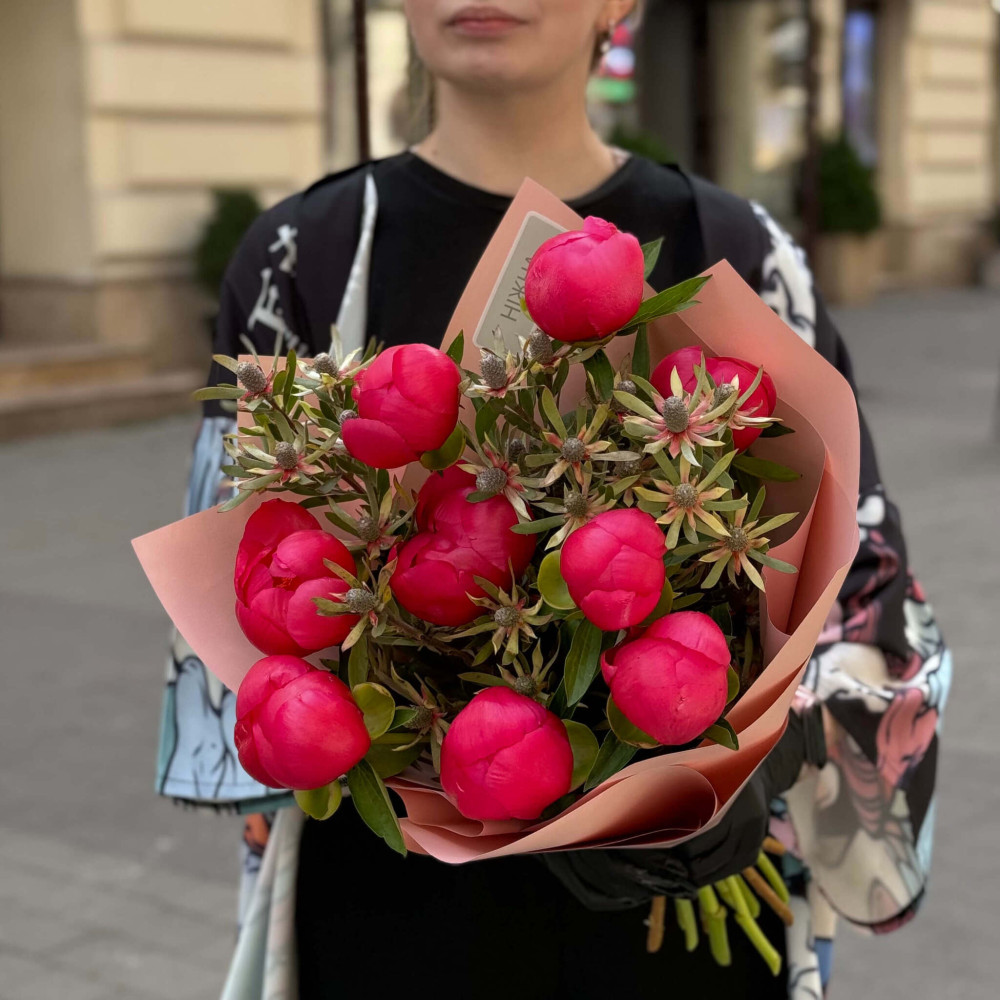 - Як замовити Яскравий букет із 9 півоній та леукадендрона «Кораловий ранок»? ❯