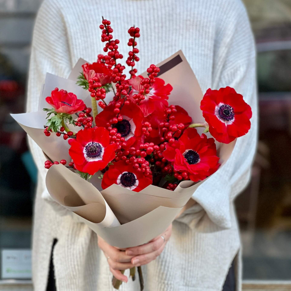 - Як замовити Яскравий букет із червоних анемонів та ілексу «Палкий поцілунок»? ❯