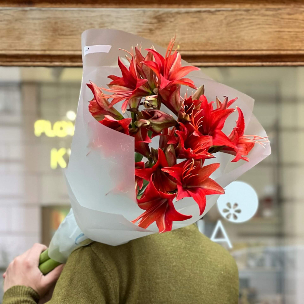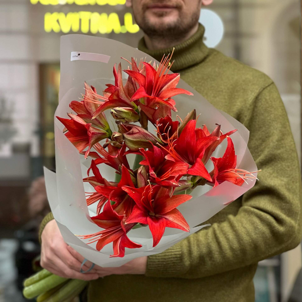 - Як замовити Яскравий букет із червоного зірчастого гіпеаструма «Запальна зірка»? ❯