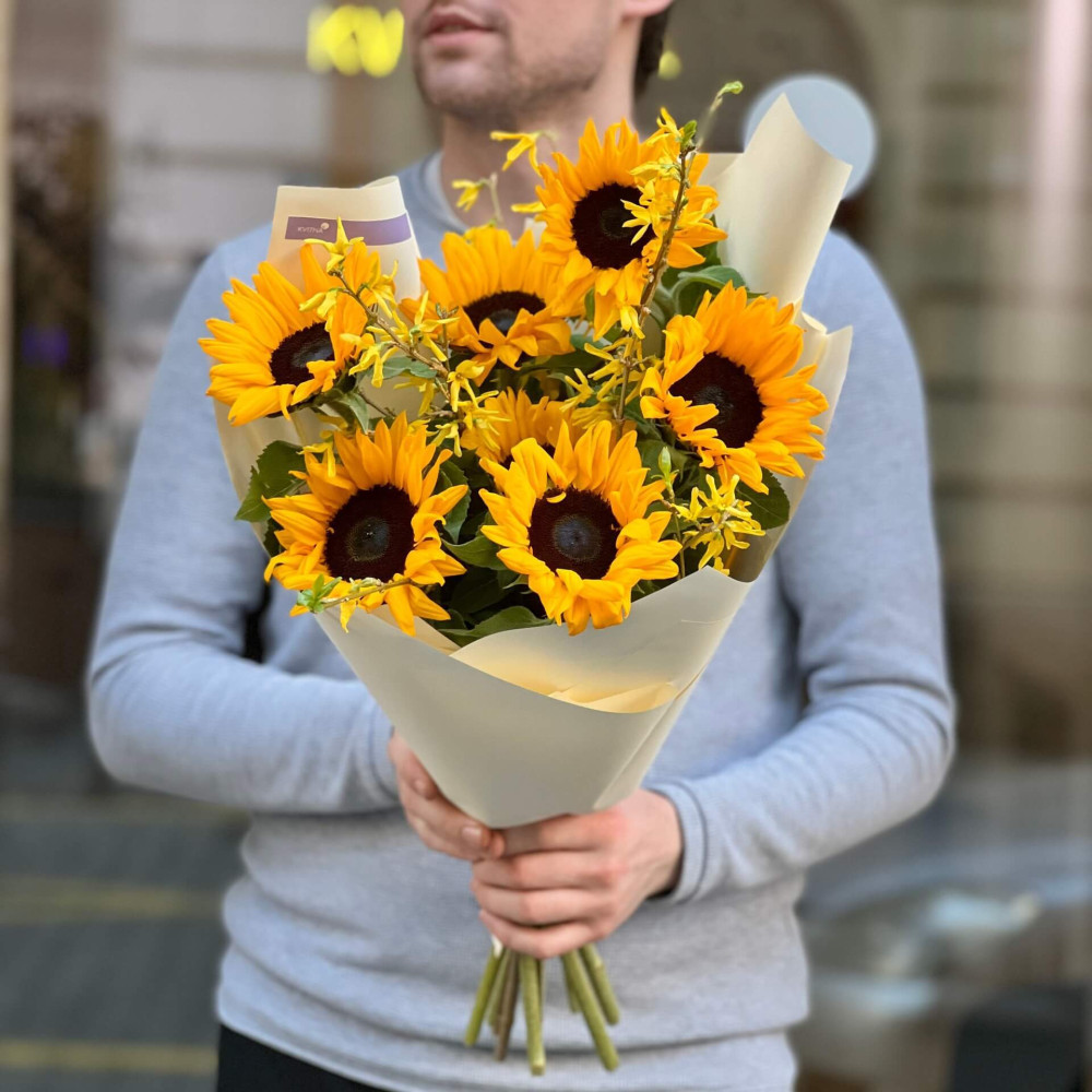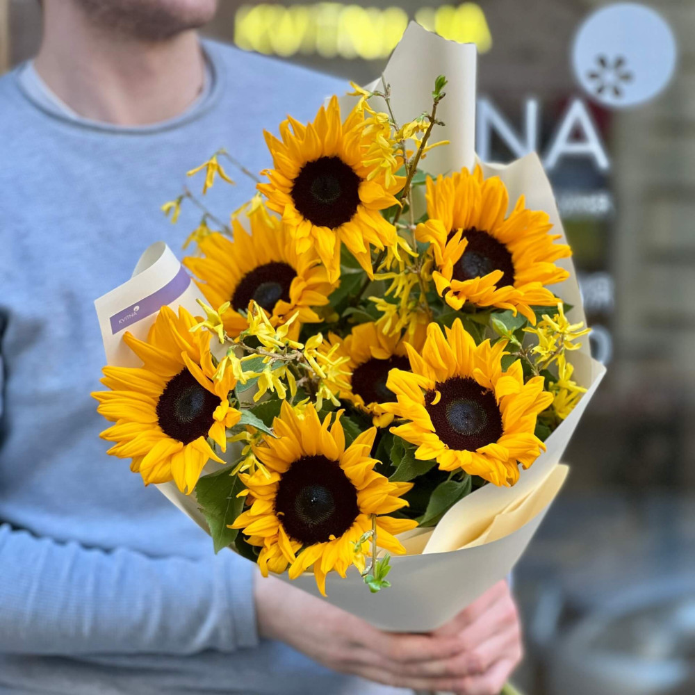 - Як замовити Яскравий букет із соняшників «Сонце серед хмар»? ❯