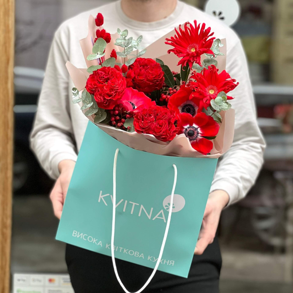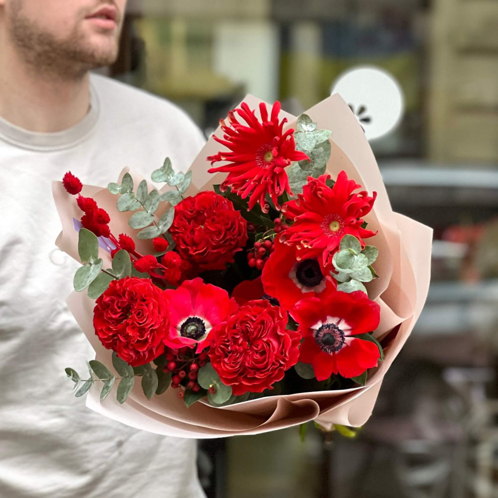 Букет в палаючому червоному кольорі – трошки колосків фалярису, вишукані півонієподібні троянди, стрункі гербери та сатинові пелюстки анемон з темними вічками, це палахкотіння кольору відтіняє спокійний срібний евкаліпт.