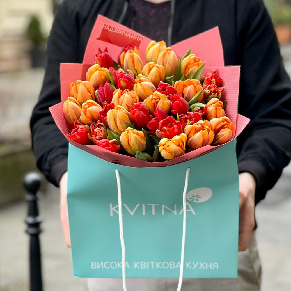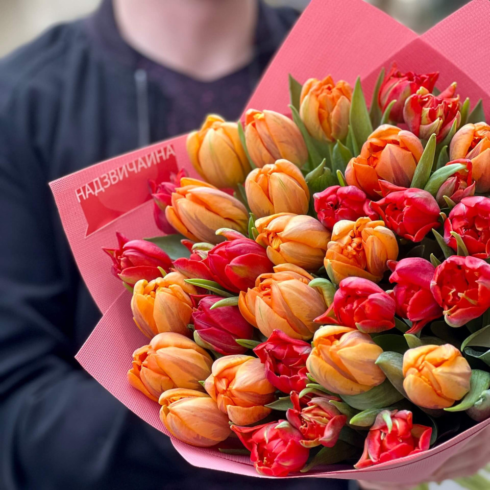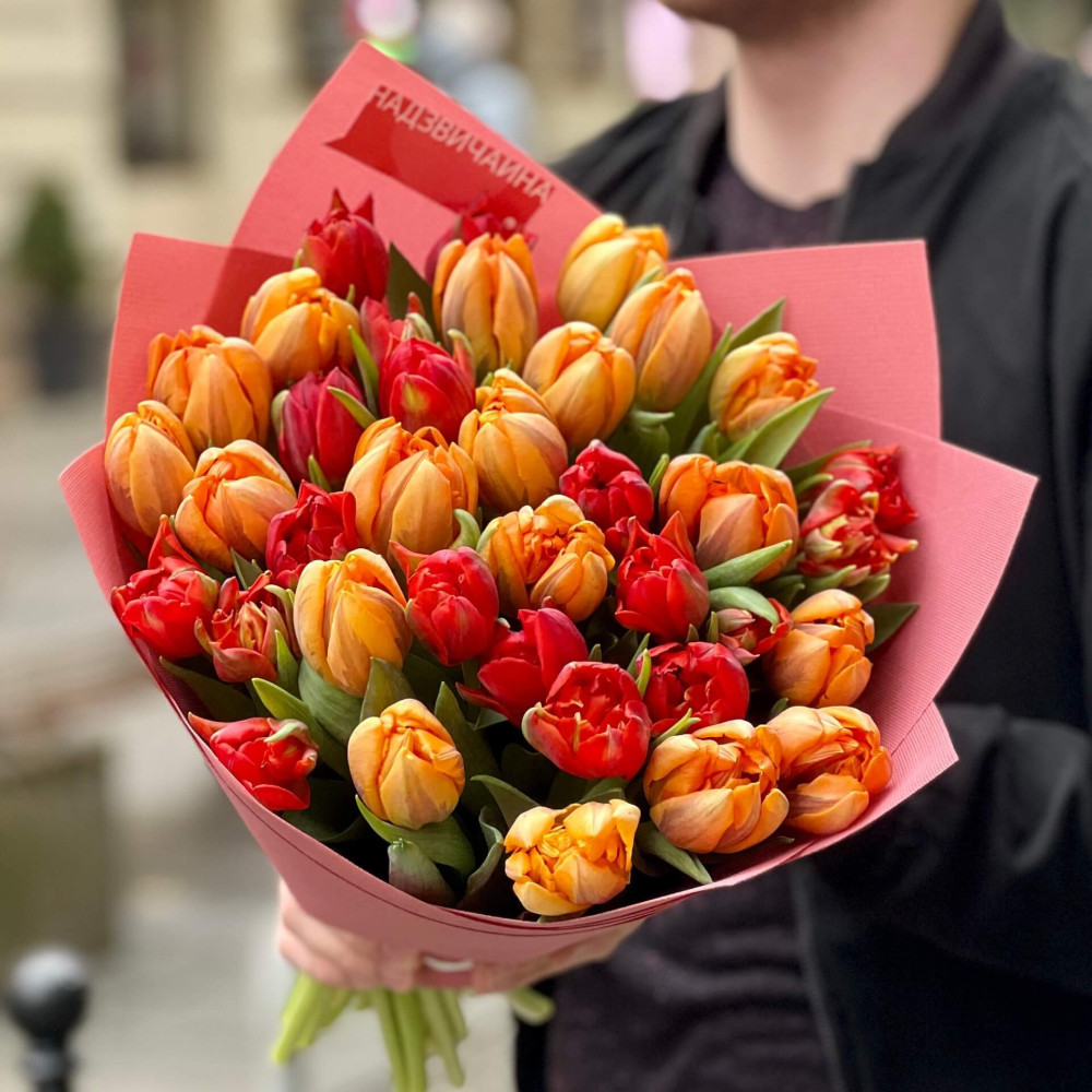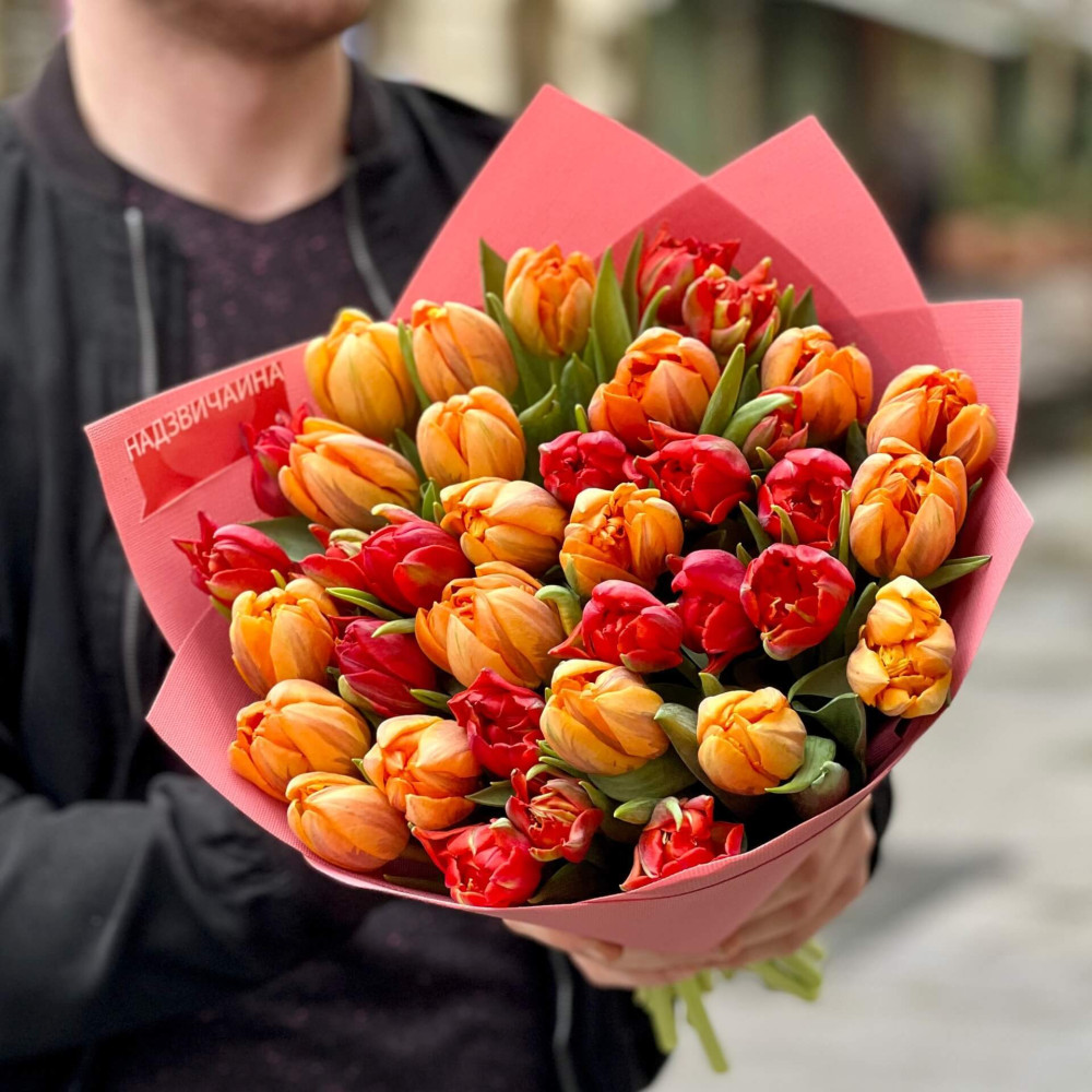 Пристрасний і гарячий мікс півонієподібних тюльпанів – червоні вуглинки породжують помаранчеве полум'я твоїх почуттів.
