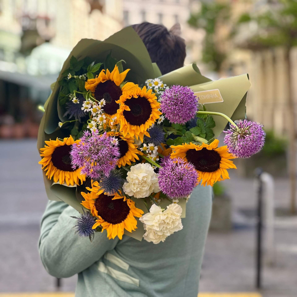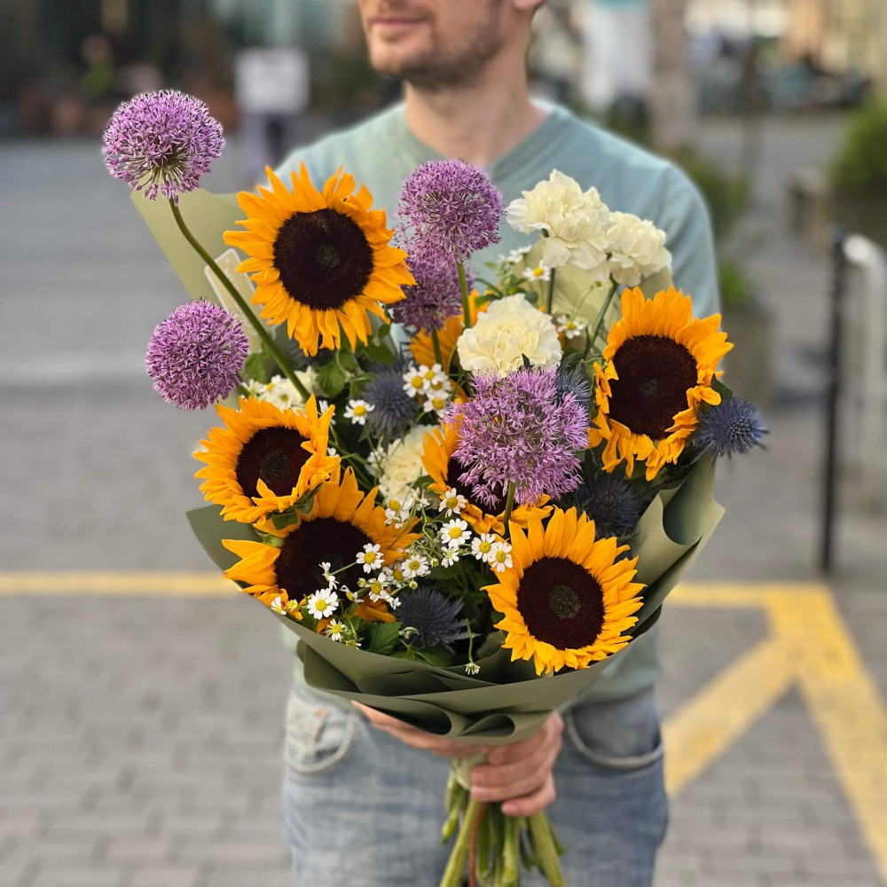 - Як замовити Яскравий букет з алліумами та соняшниками «Мандруюча галактика»? ❯