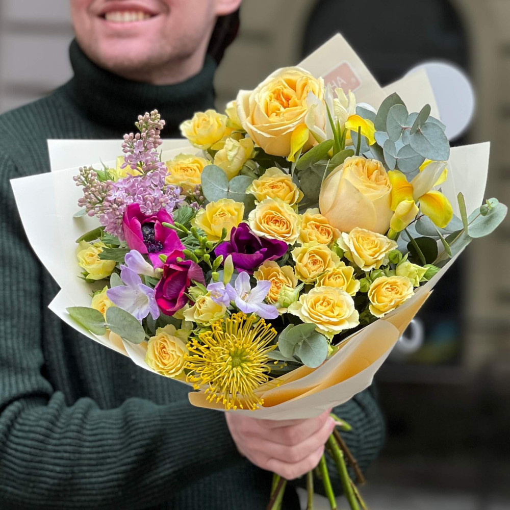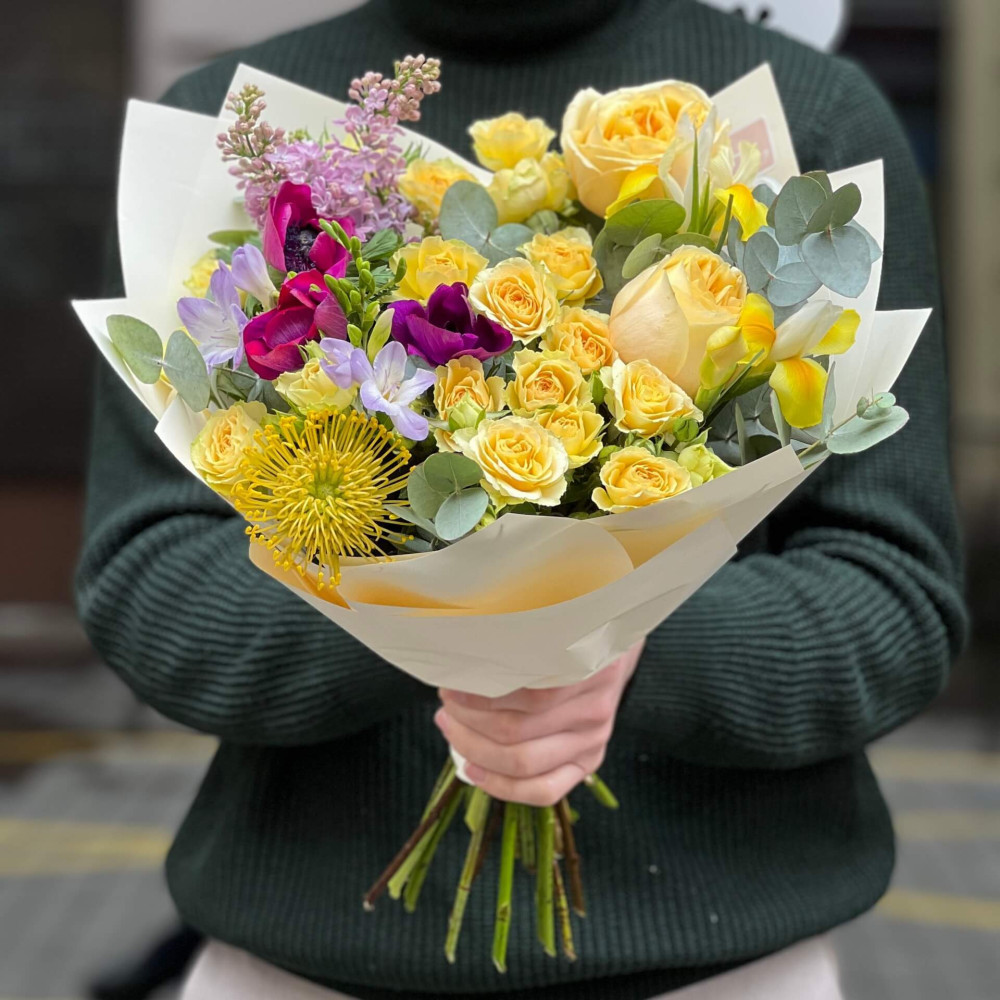 Квіти: Анемон, Троянда піоновидна кущова, Троянда піоновидна, Бузок, Фрезія, Леукоспермум, Евкаліпт, Ірис