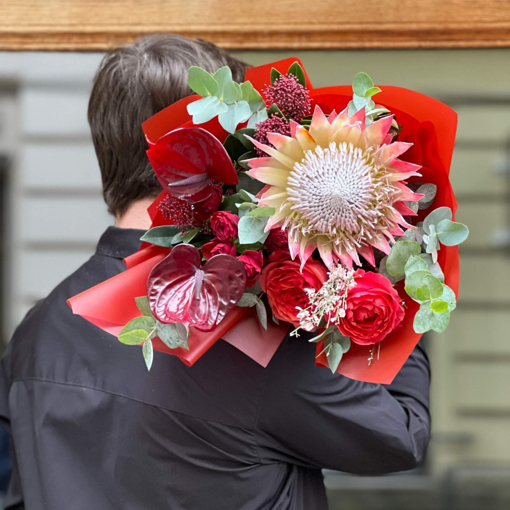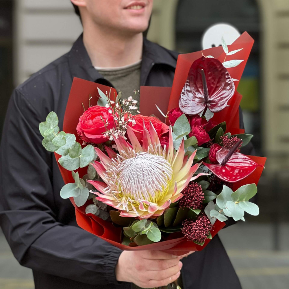 - Як замовити Яскравий букет з екзотичною протеєю «Рубіновий спалах»? ❯