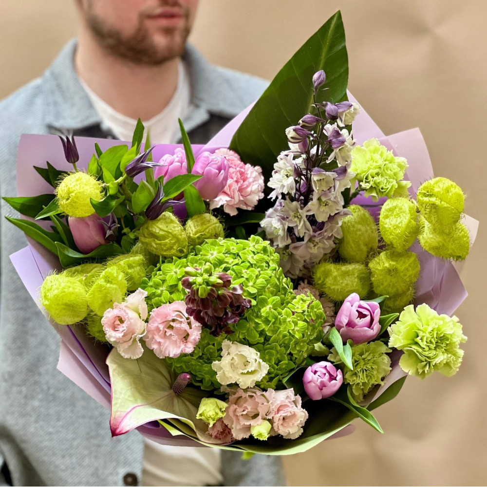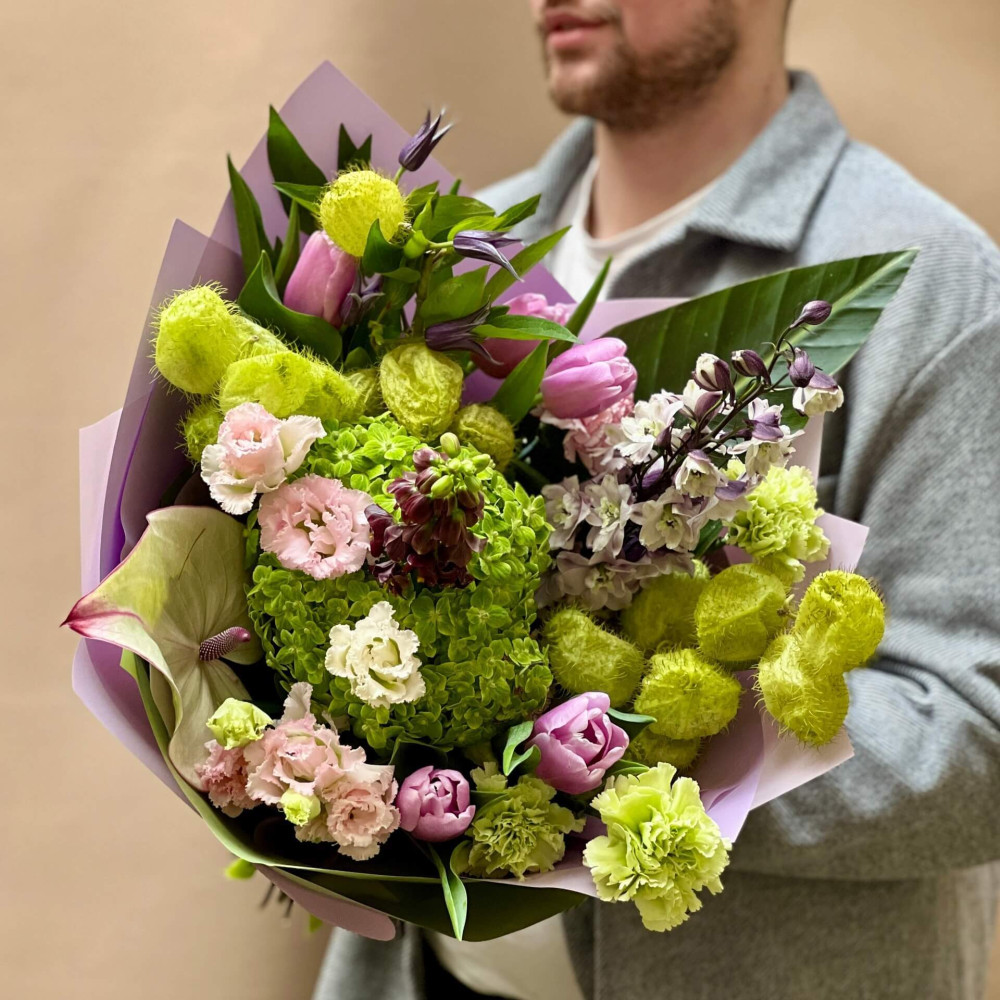 Чудовий мальовничий букет, де відтінки і фактури зеленого поєднуються з відтінками і фактурами пурпурового та рожевого кольору. Незвичайні пухнасті кульки асклепіаса, зелена гортензія, гладенький лист стреліції, цвіт антуріума та рожеві повноквіткові тюльпани і фіалковий стрункий дельфініум. Кольори весняної магії.