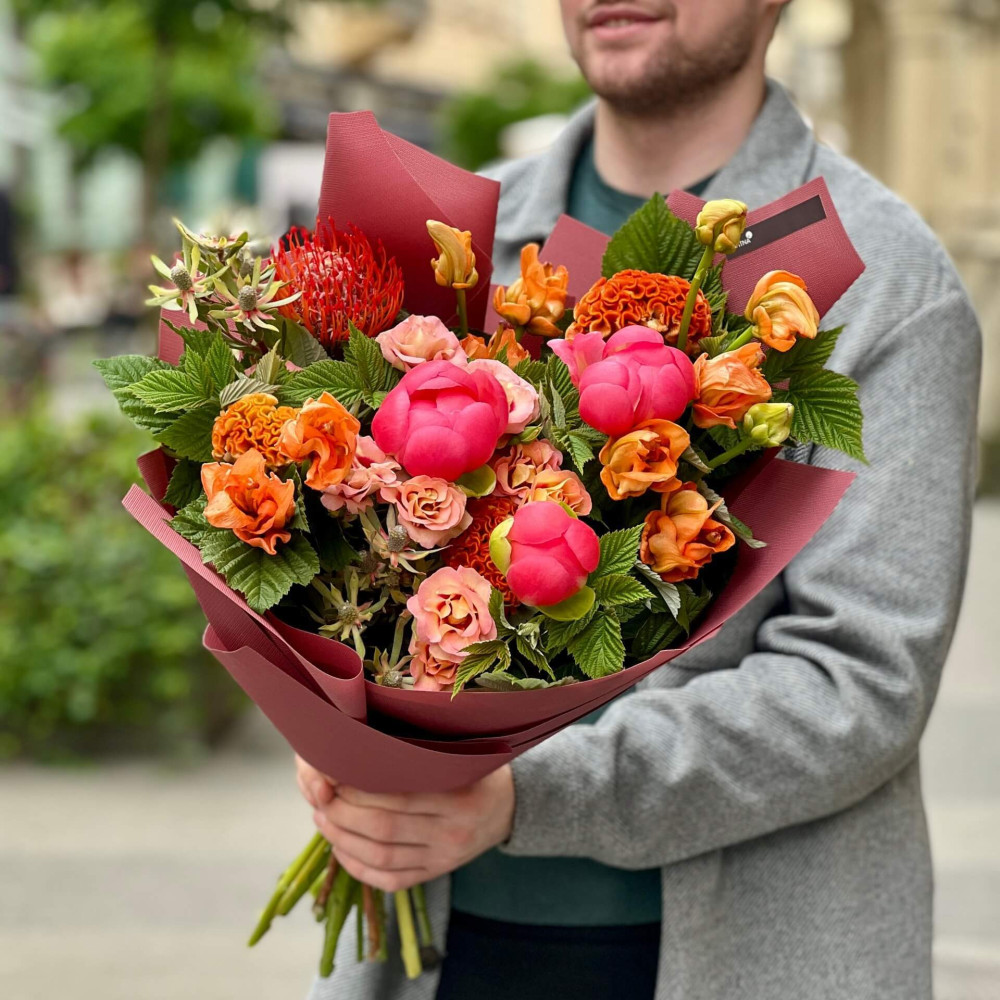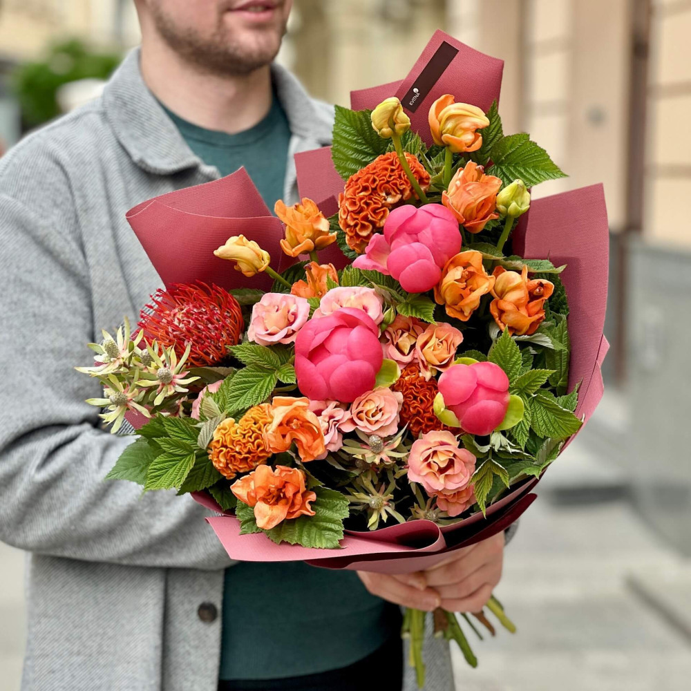 - Як замовити Яскравий букет з ліліями та півоніями «Коралова думка»? ❯