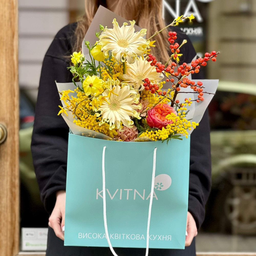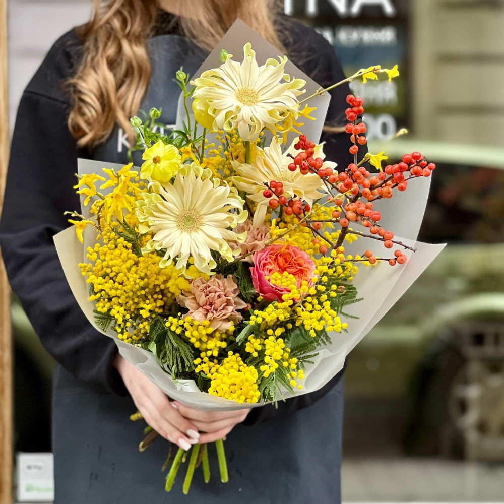 Квіти: Мімоза, Гербера, Ілекс, Діантус (Гвоздика), Троянда піоновидна, Ранункулюс, Форзиція