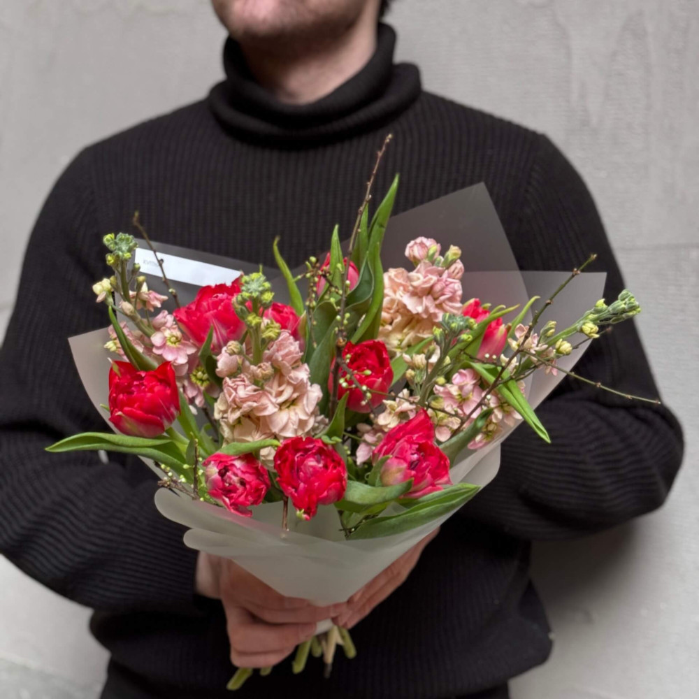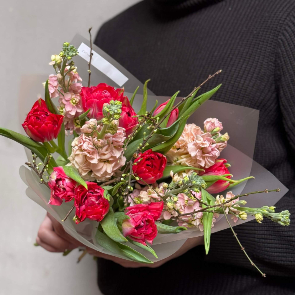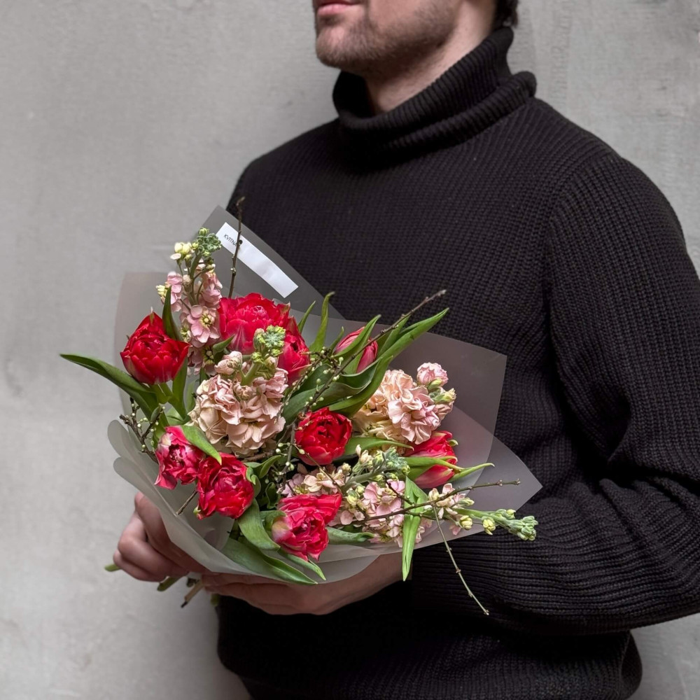 - Як замовити Яскравий букет з піоновидними тюльпанами та матіолою «Солодкий мокко»? ❯