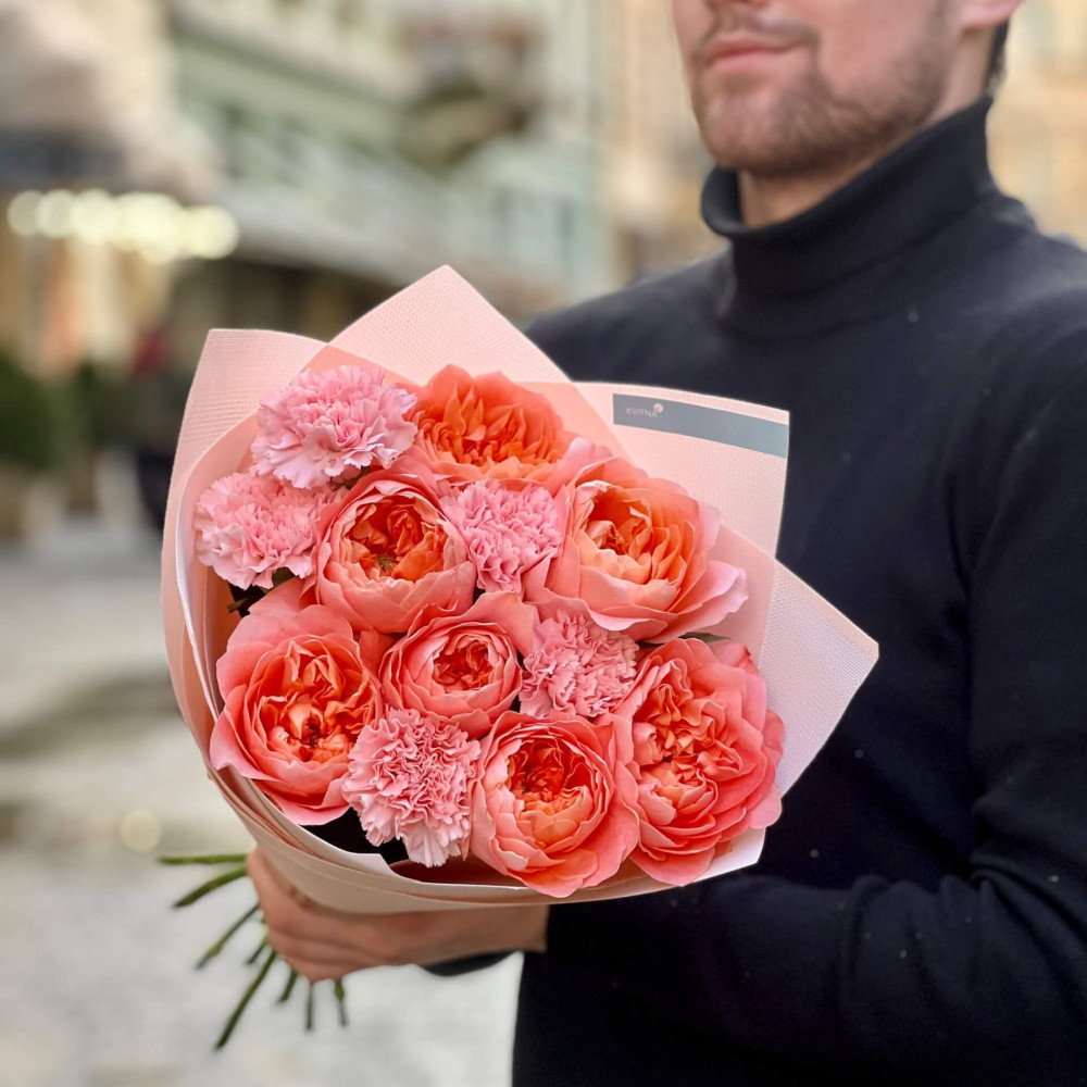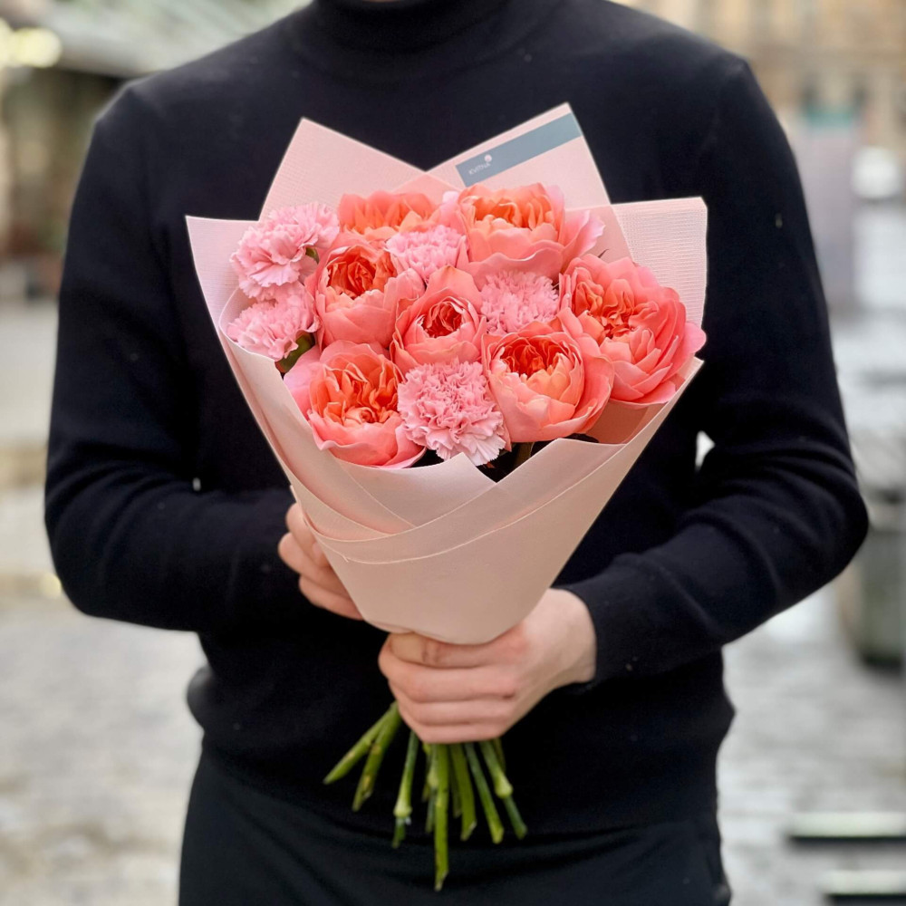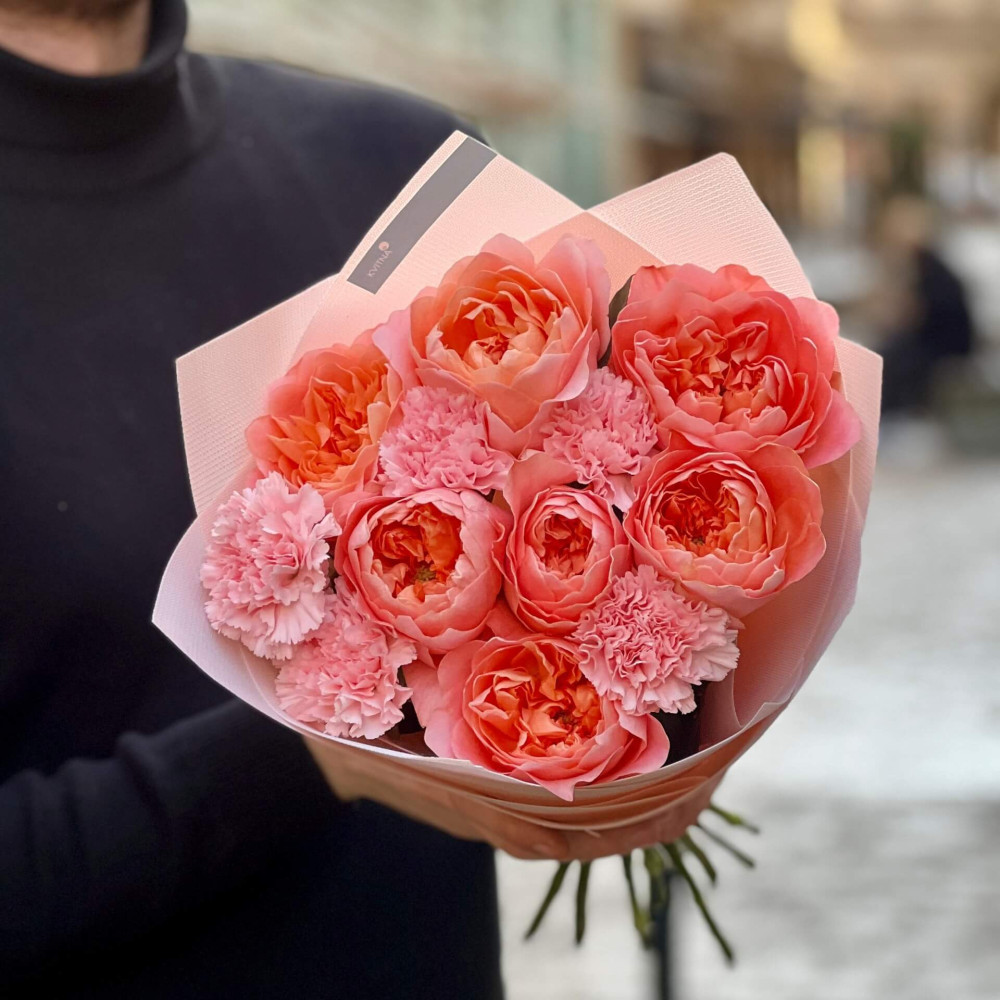 - Як замовити Яскравий букет з піоновидною трояндою та діантусами «Рожевий сюрприз»? ❯
