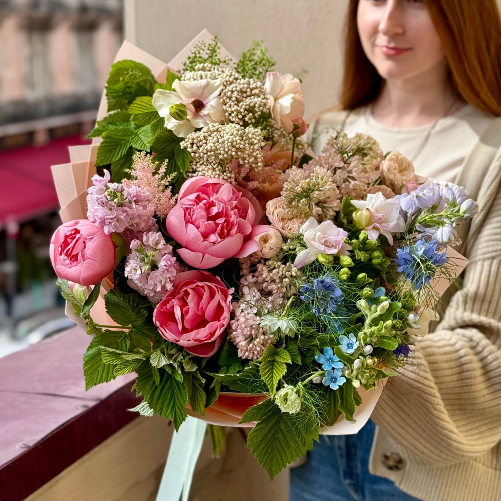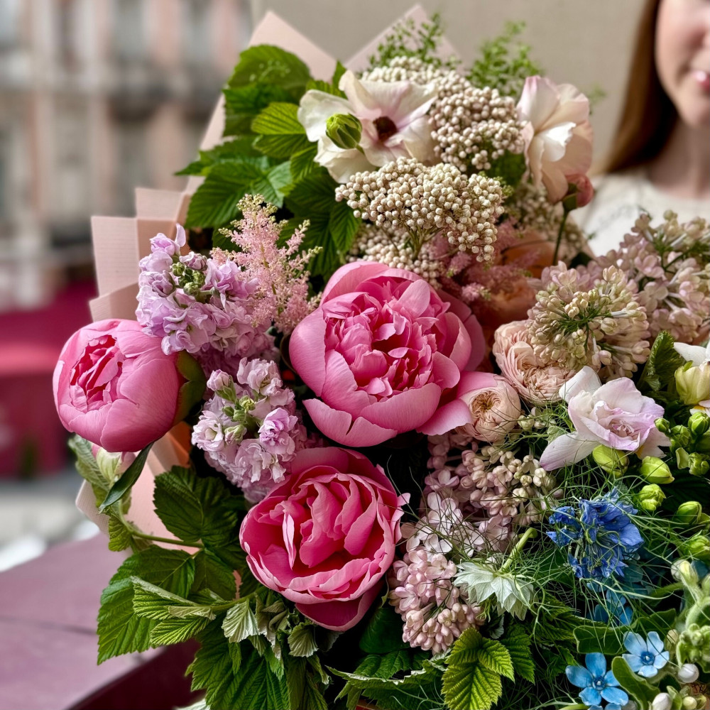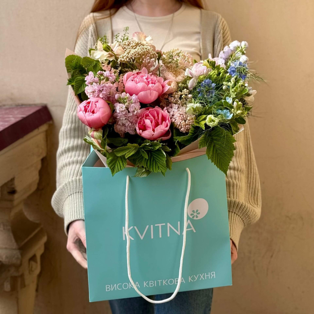 Квіти: Оксіпеталум, Фрезія, Ранункулюс, Матіола, Півонія, Нігела, Малина (листя), Алліум, Озотамнус