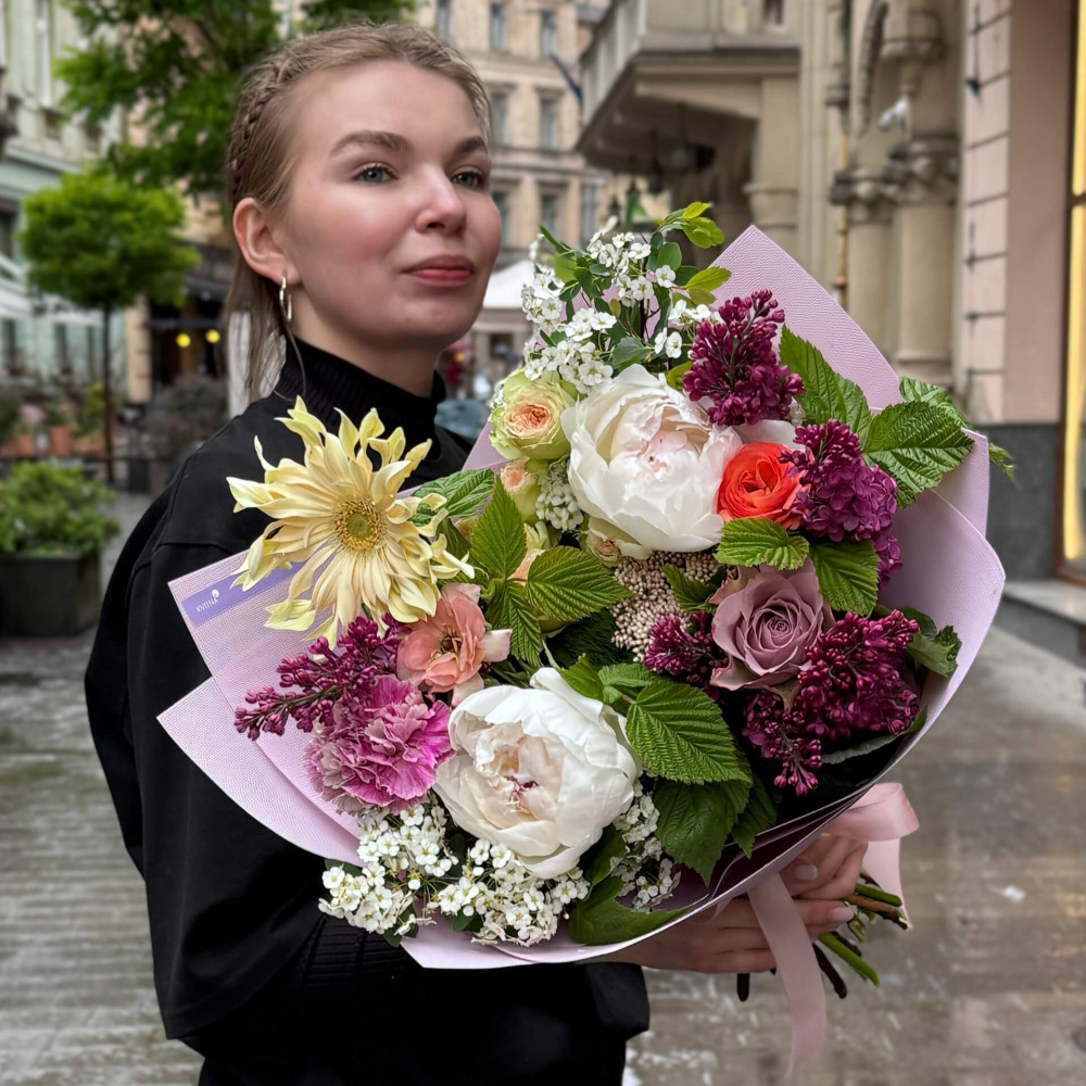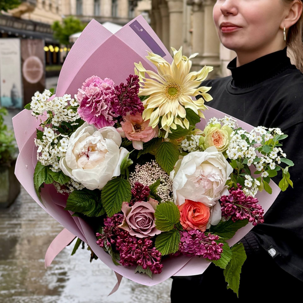 - Як замовити Яскравий букет з півоніями та бузком «Чарівний сад»? ❯