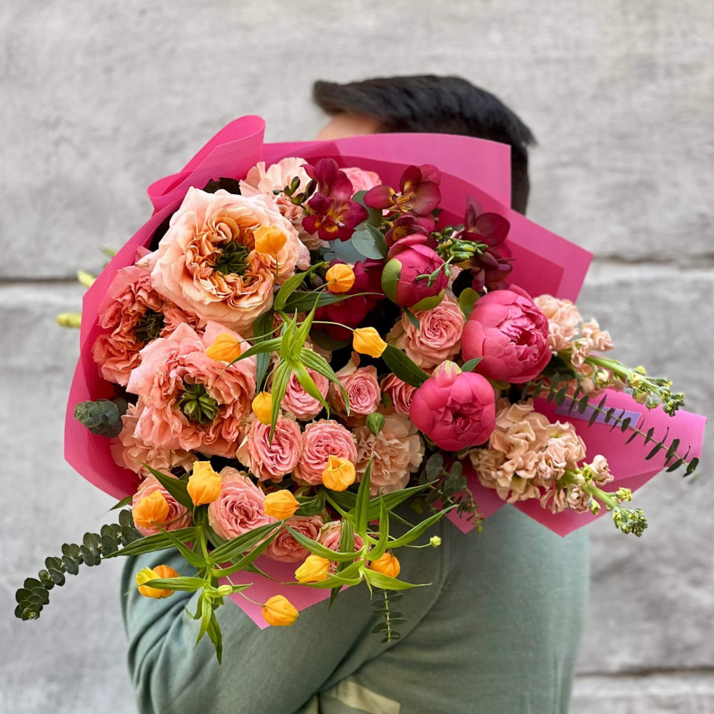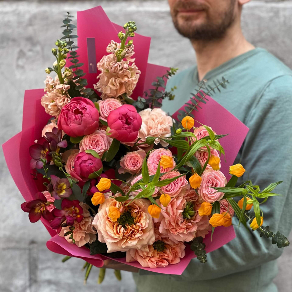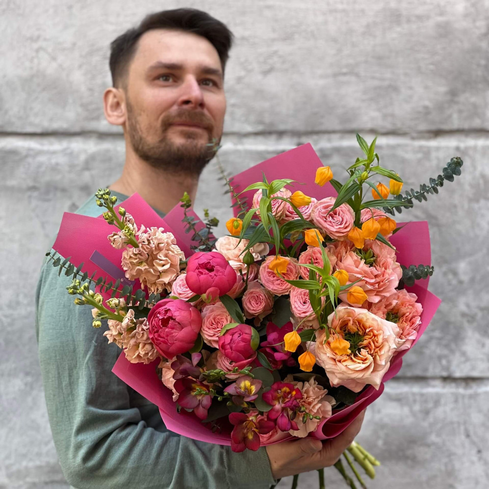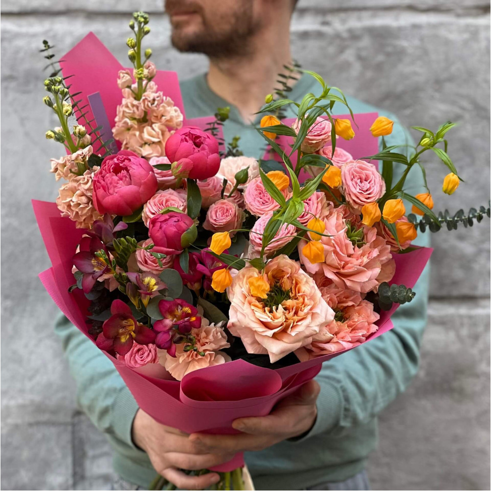 Квіти: Півонія, Сандерсонія, Троянда піоновидна кущова, Троянда піоновидна, Діантус (Гвоздика), Фрезія, Евкаліпт, Матіола