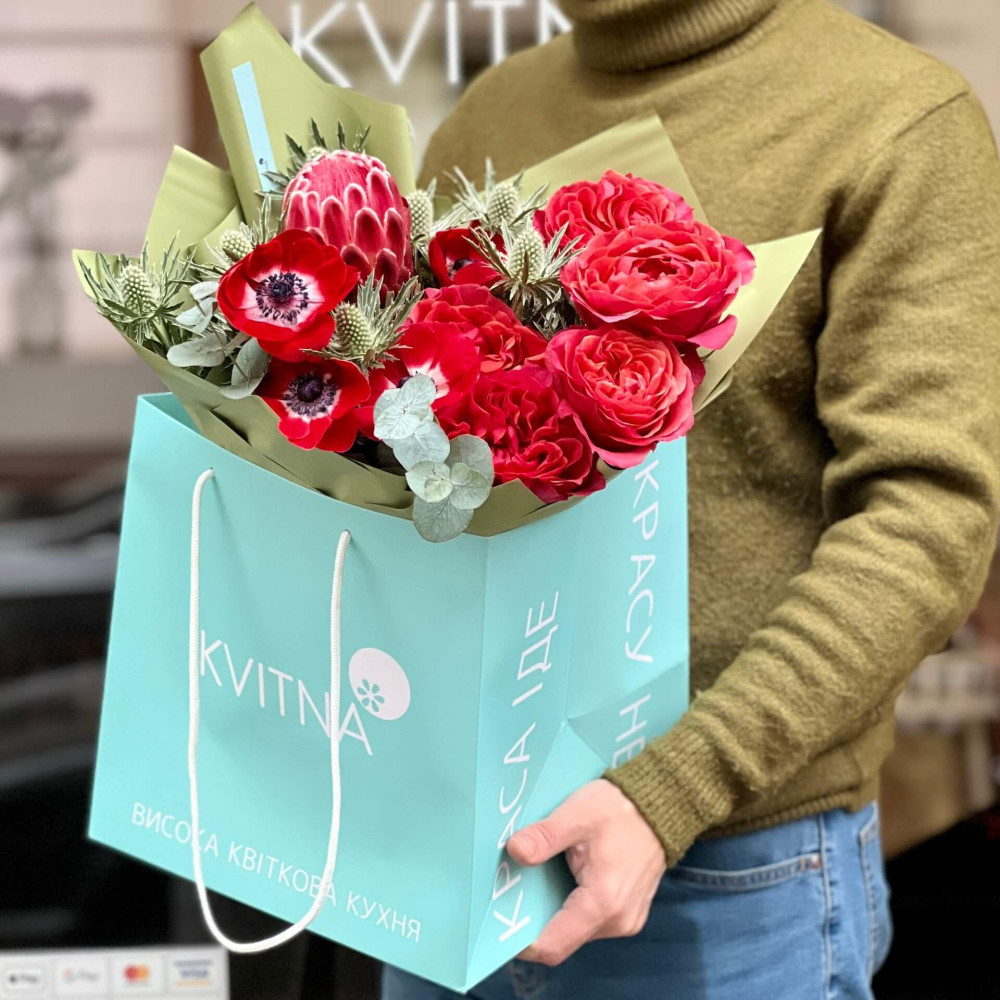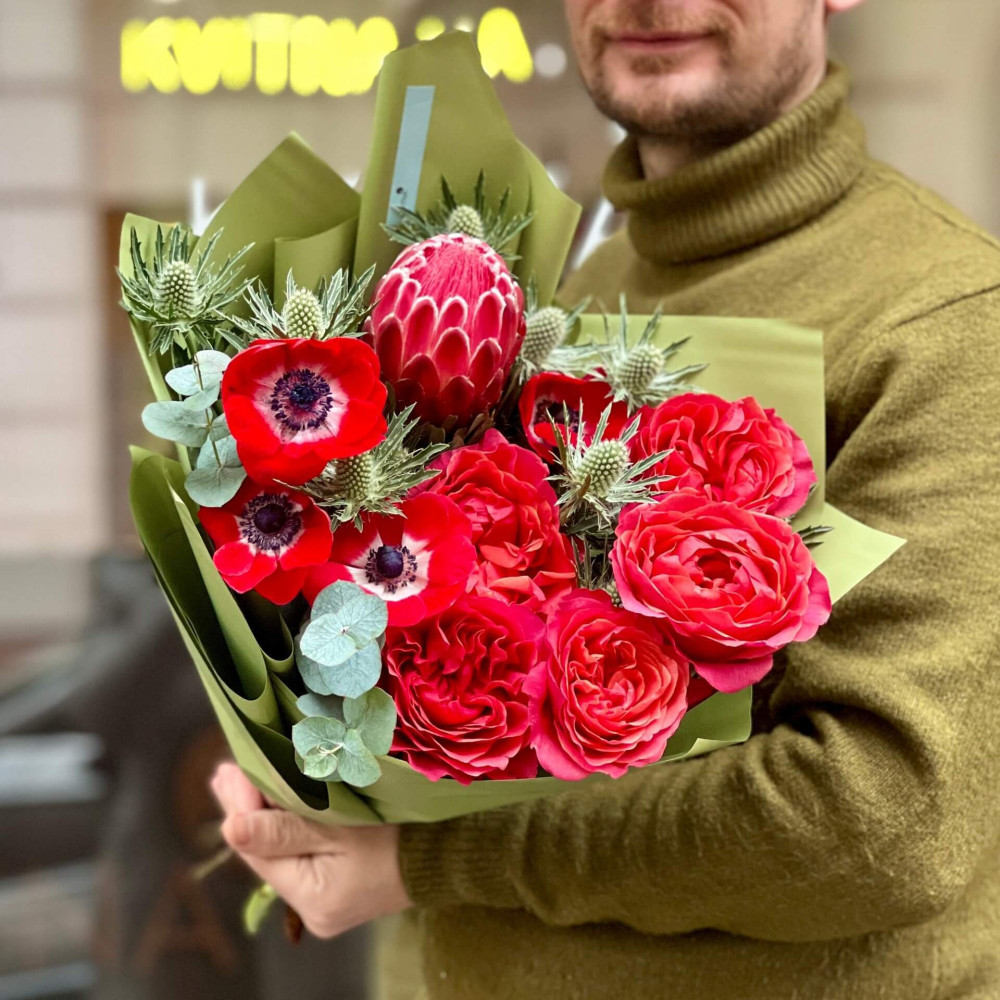 Чудова яскрава екзотична протея виступає солістом у цьому букеті, а його доповнюють коралово-червоні півонієподібні троянди, червоні анемони і зелені колючі квіти ерінгіума. Незвичайний і яскравий букет, так само, як і емоції, які дарує любов.