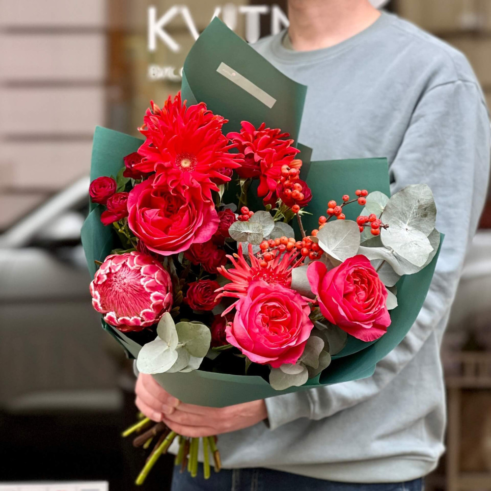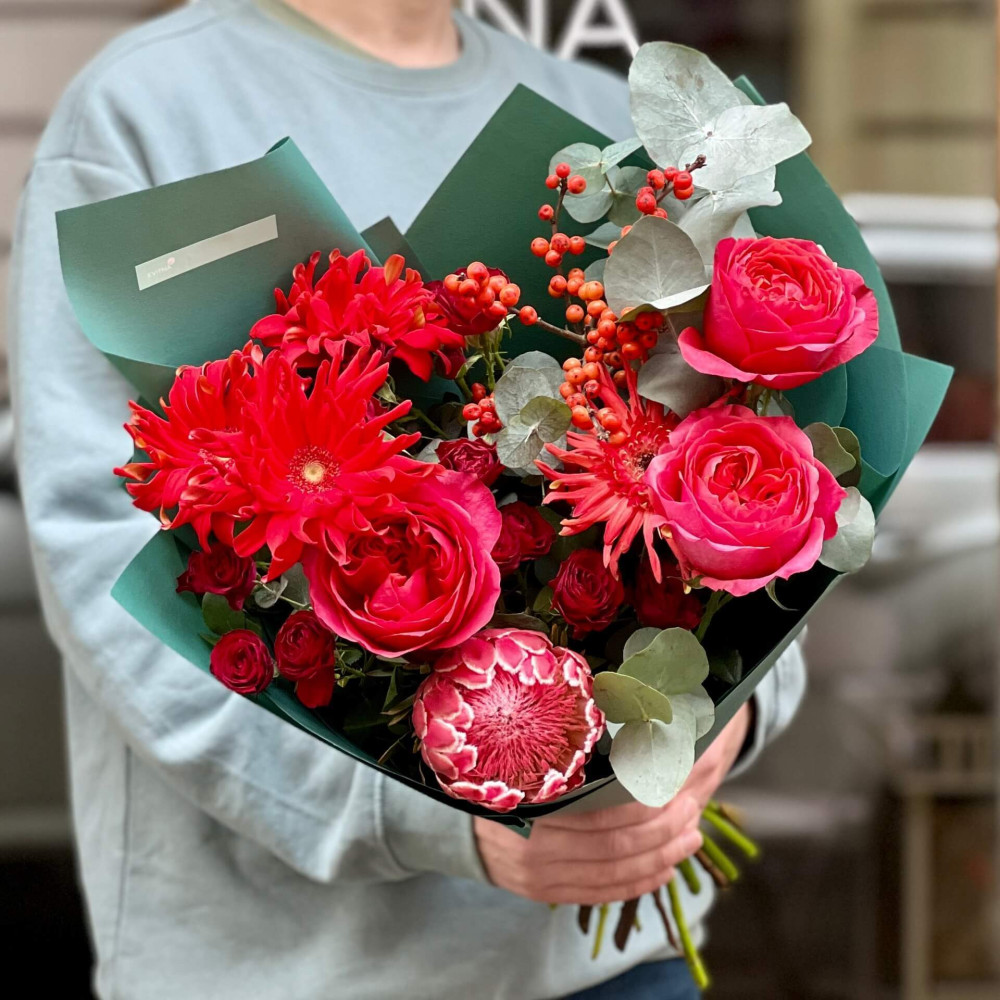 Насичені відтінки червоного та коралового кольорів – екзотична протея, півонієподібна та кущова троянда, променисті гербери і сріблясто-зелений евкаліпт. Немов зрілий гранат, смаком якого хочеться насолодитися.