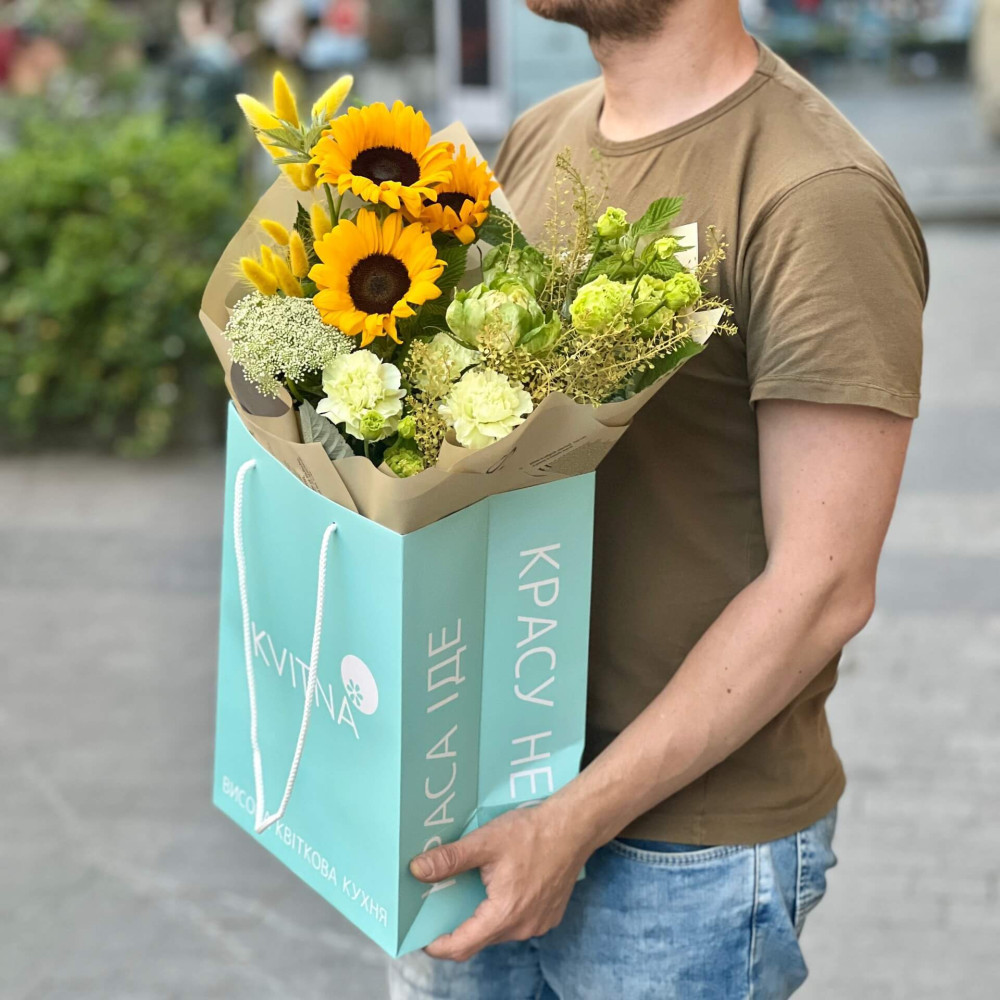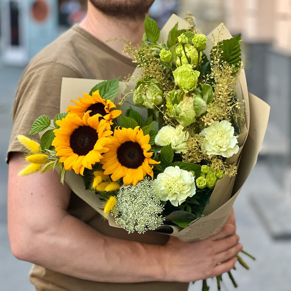Квіти: Соняшник, Діантус (Гвоздика), Лагурус, Троянда піоновидна, Еустома, Аммі, Тласпі