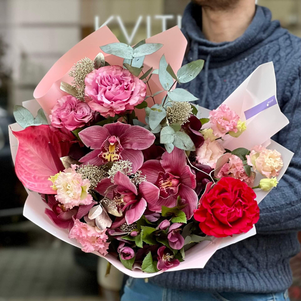 - Як замовити Яскравий букет з цимбідіумом та півонієподібними трояндами «Малиновий оксамит»? ❯
