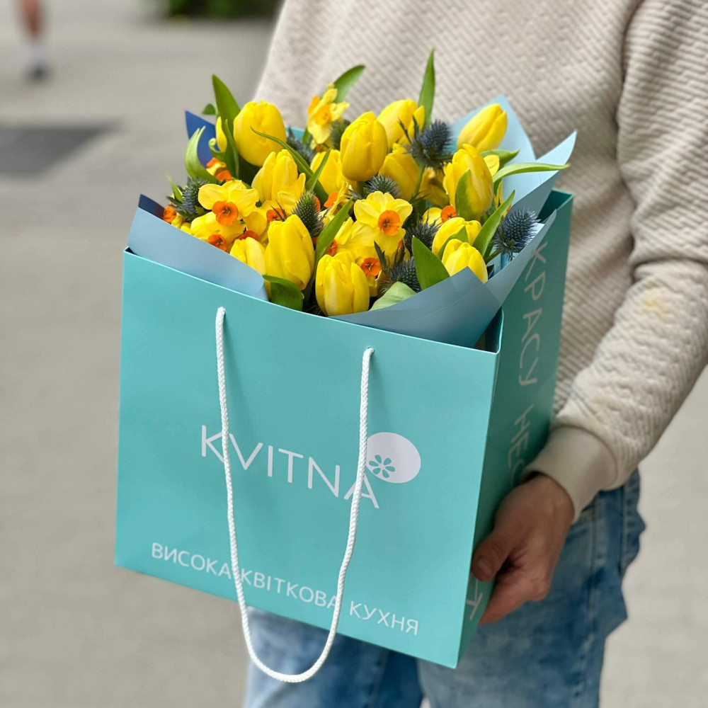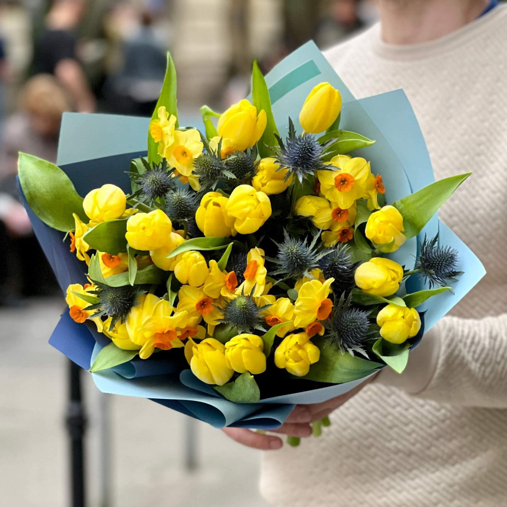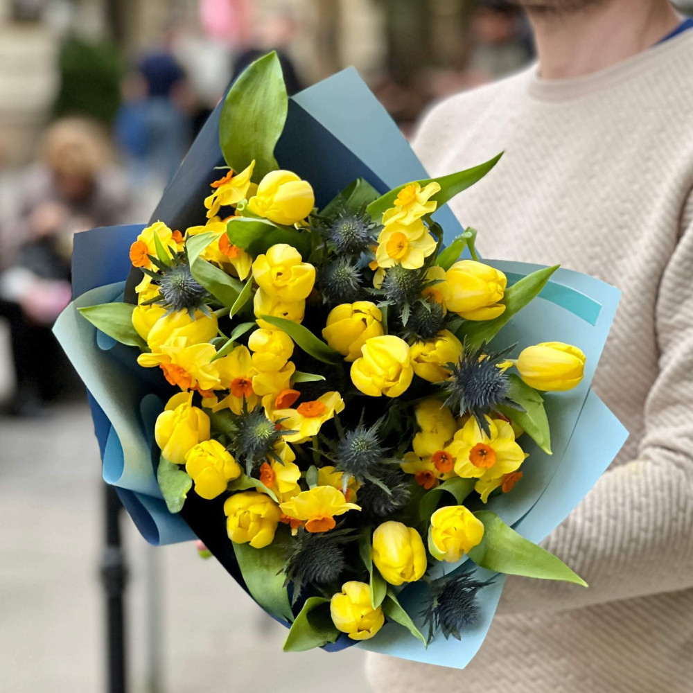 Яскраво-жовті тюльпани, ароматні жовті запашні нарциси особливо помітні на фоні сапфірово-синього ерінгіума. Контрастний і весняний букет!