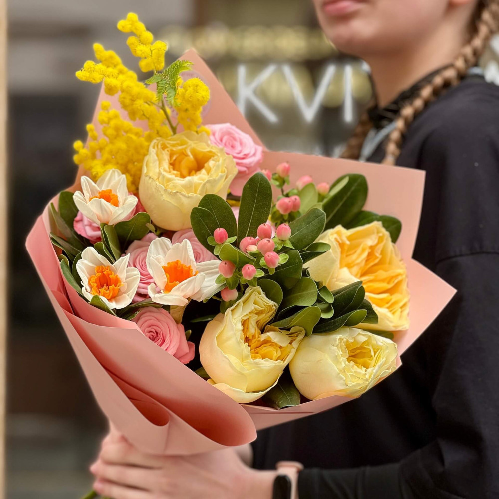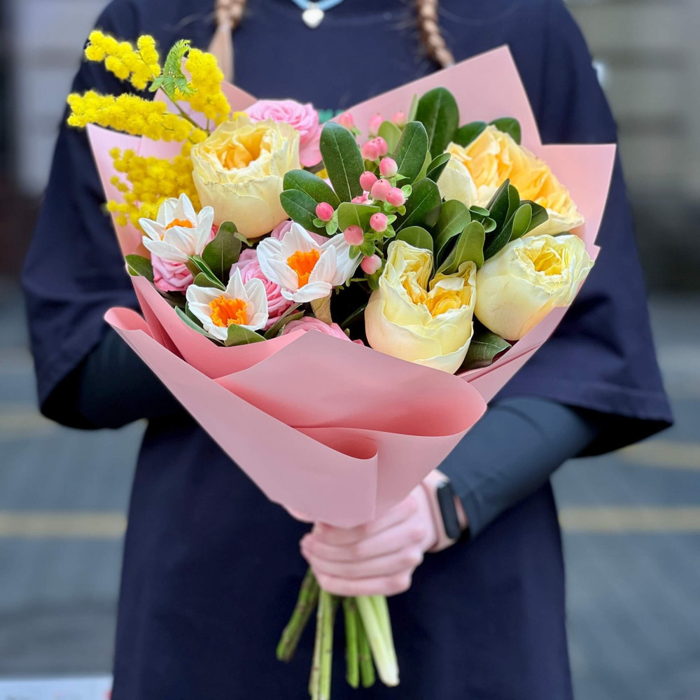 Квіти: Троянда піоновидна кущова, Троянда піоновидна, Мімоза, Піттоспорум, Нарцис, Хіперикум