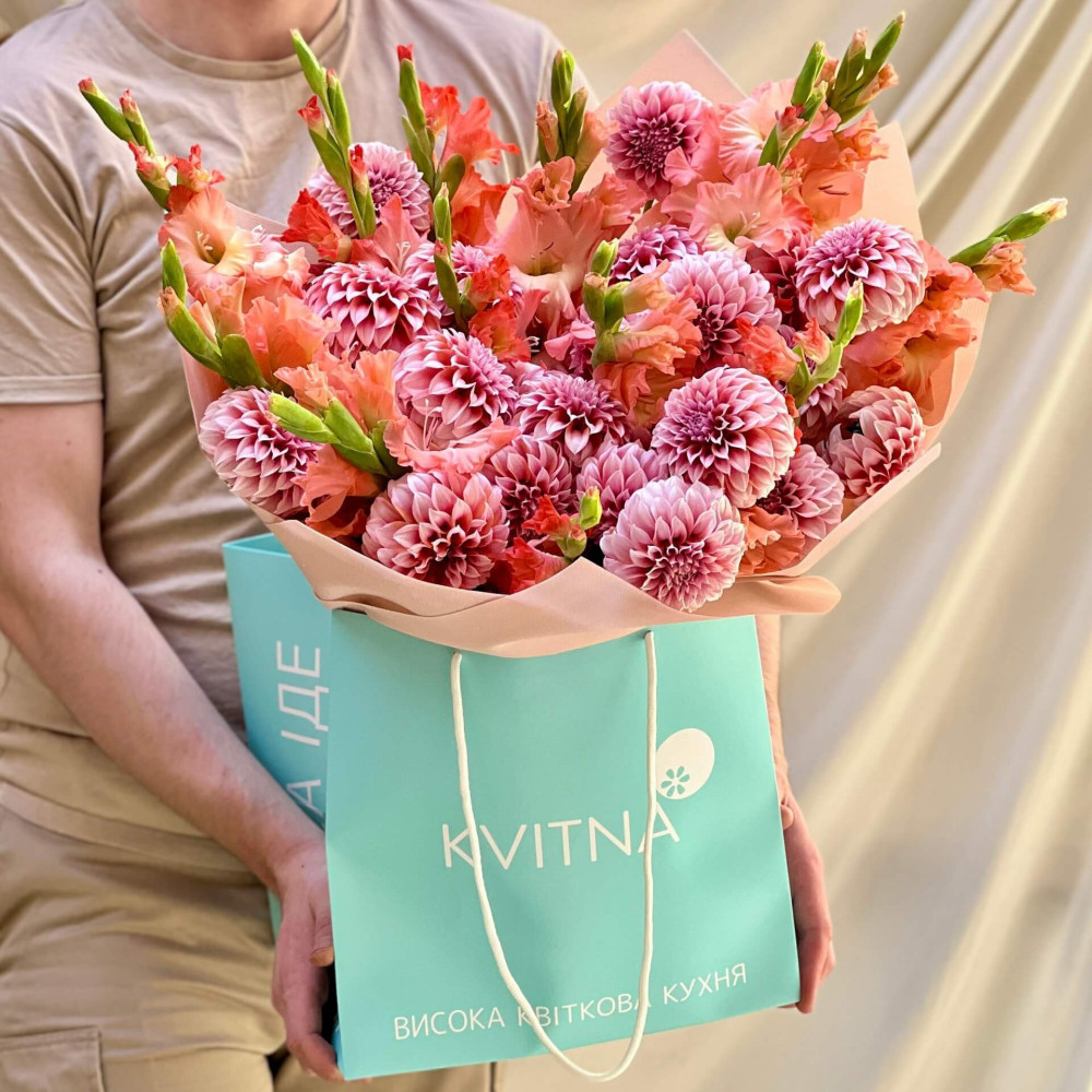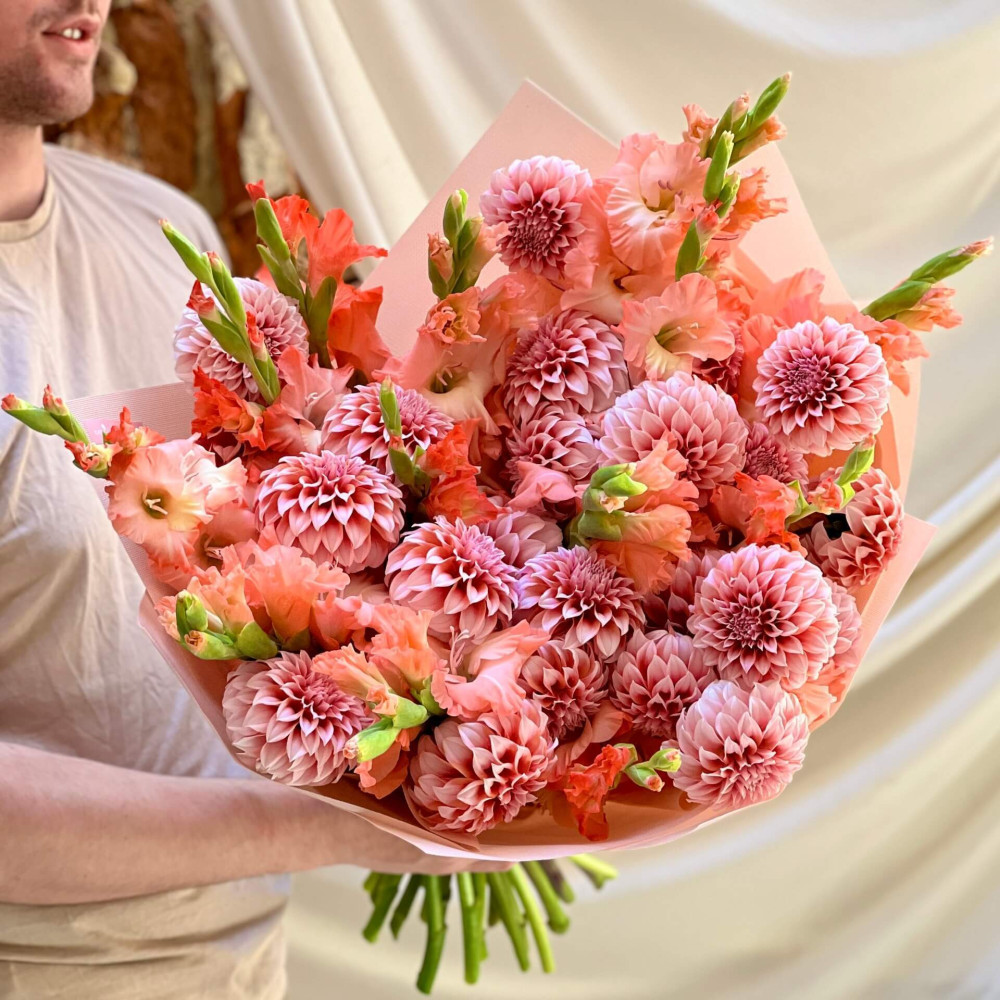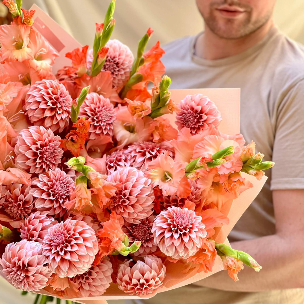 - Як замовити Яскравий букет з жоржин та гладіолусів «Абрикосове поле»? ❯