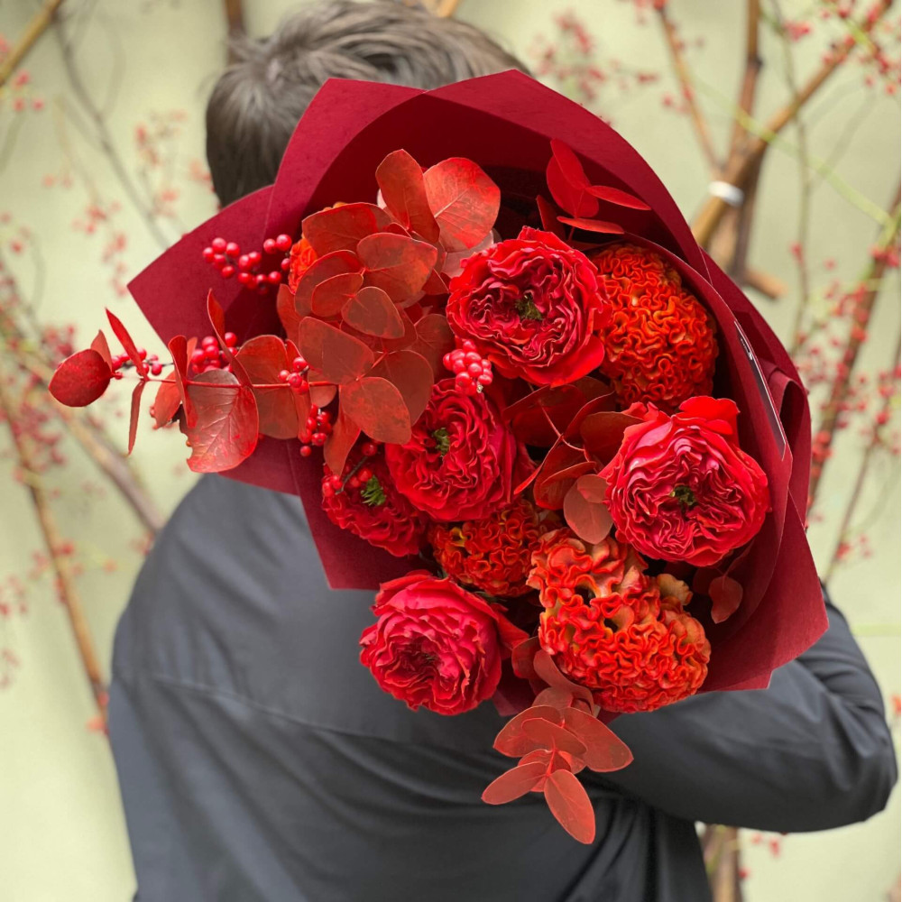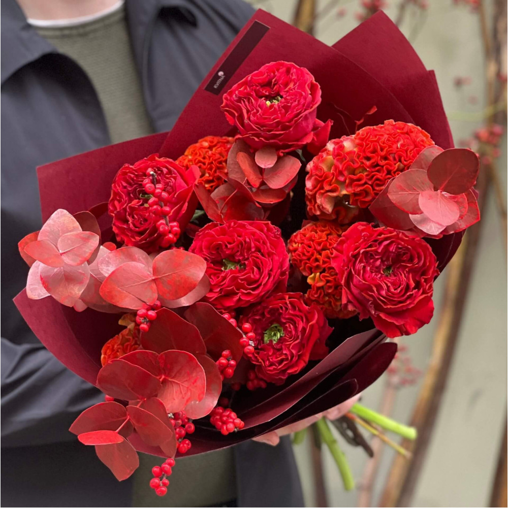 Квіти: Целозія, Евкаліпт, Ілекс, Троянда піоновидна