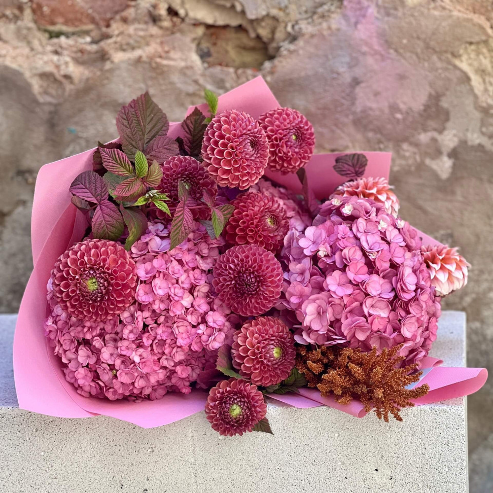 Квіти: Гортензія, Жоржина, Амарант темний, Малина (листя)