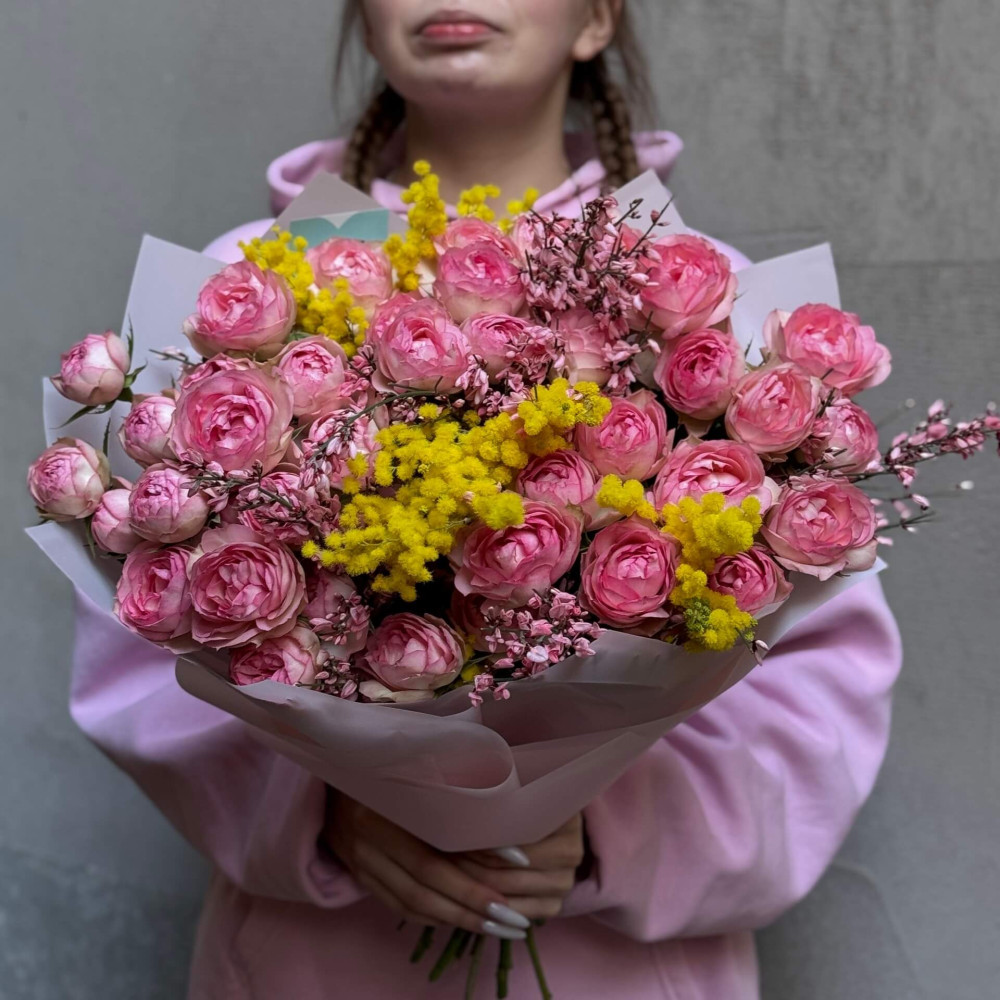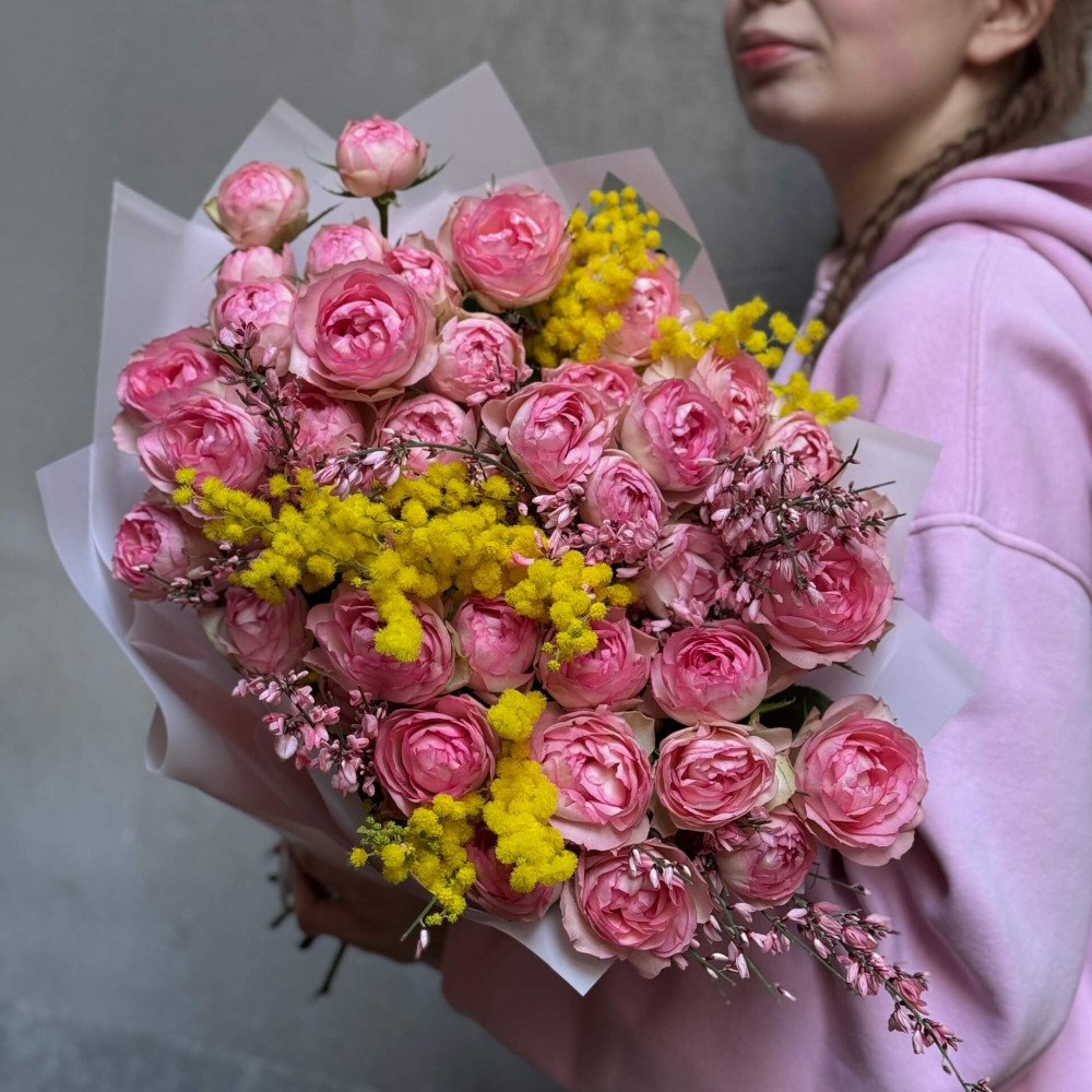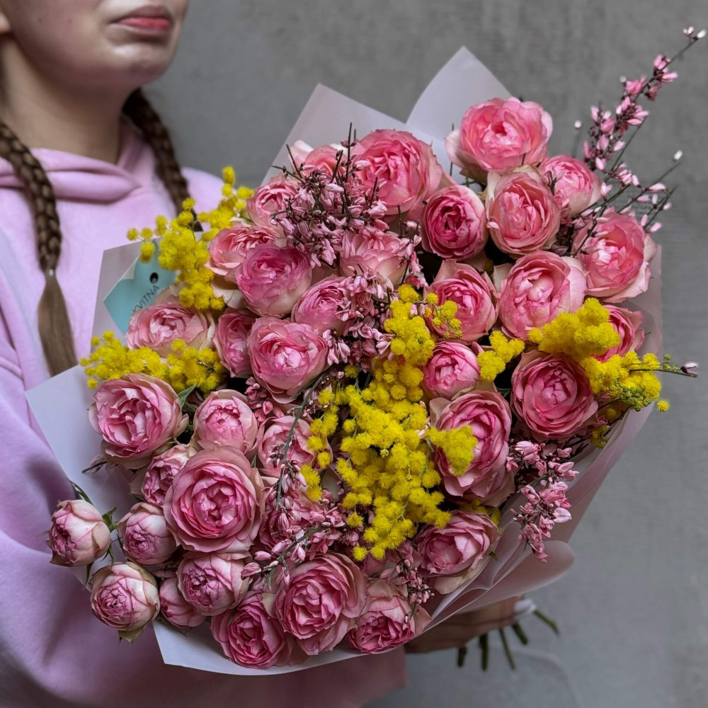 Квіти: Троянда піоновидна кущова, Геніста, Мімоза