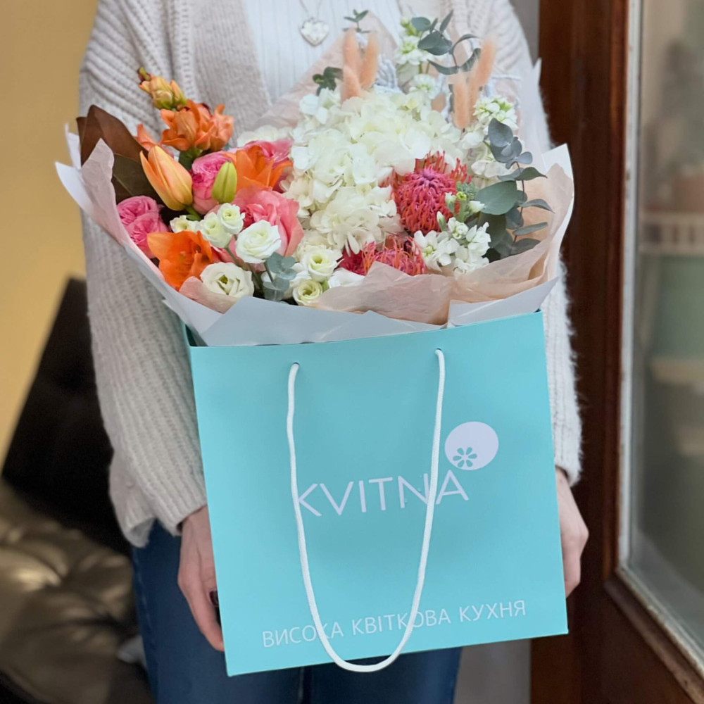 - Букети від Kvitna доставляються у фірмовому пакуванні, яке потрібно зняти при установці квітів у вазу. Не зрізайте стрічку, звʼязуючу букет, щоб зберегти його форму.