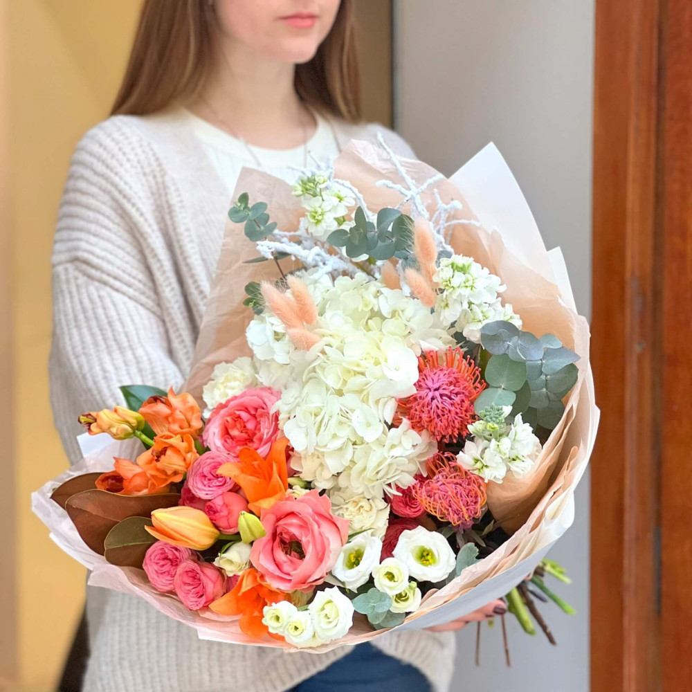 Квіти: Еустома, Лілія, Троянда піоновидна, Гортензія, Леукоспермум, Матіола, Евкаліпт, Магнолія, Лагурус