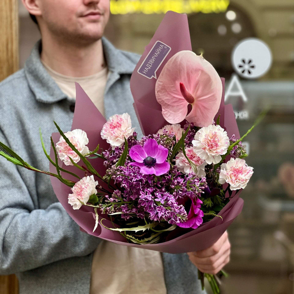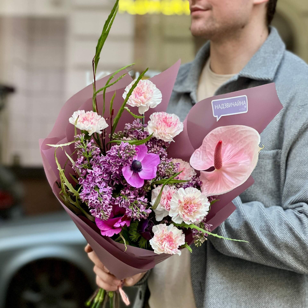 Чудовий букет з бузком та діантусом в фіолетово-рожевих кольорах, а екзотичний акцент задає йому порцеляново-рожевий антуріум. Букет, яким можна приємно здивувати.