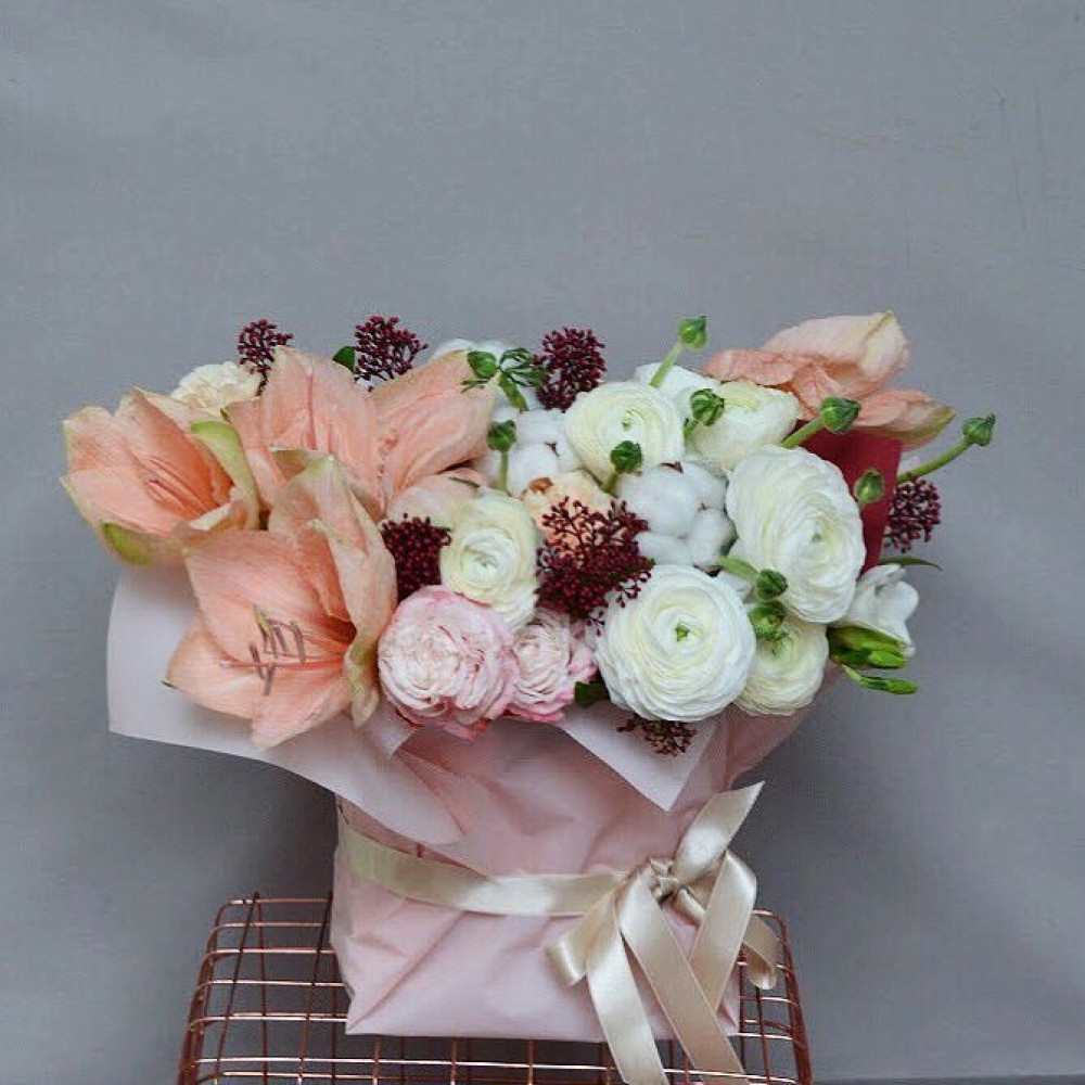 Нехай композиція (коробка, кошик, сніп) з квітами від Квітна тішить Вас якнайдовше!