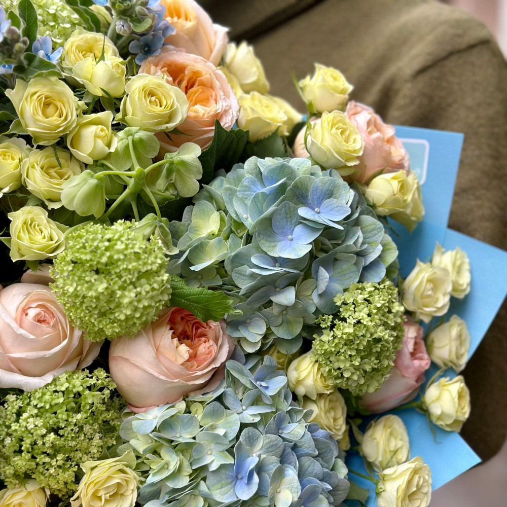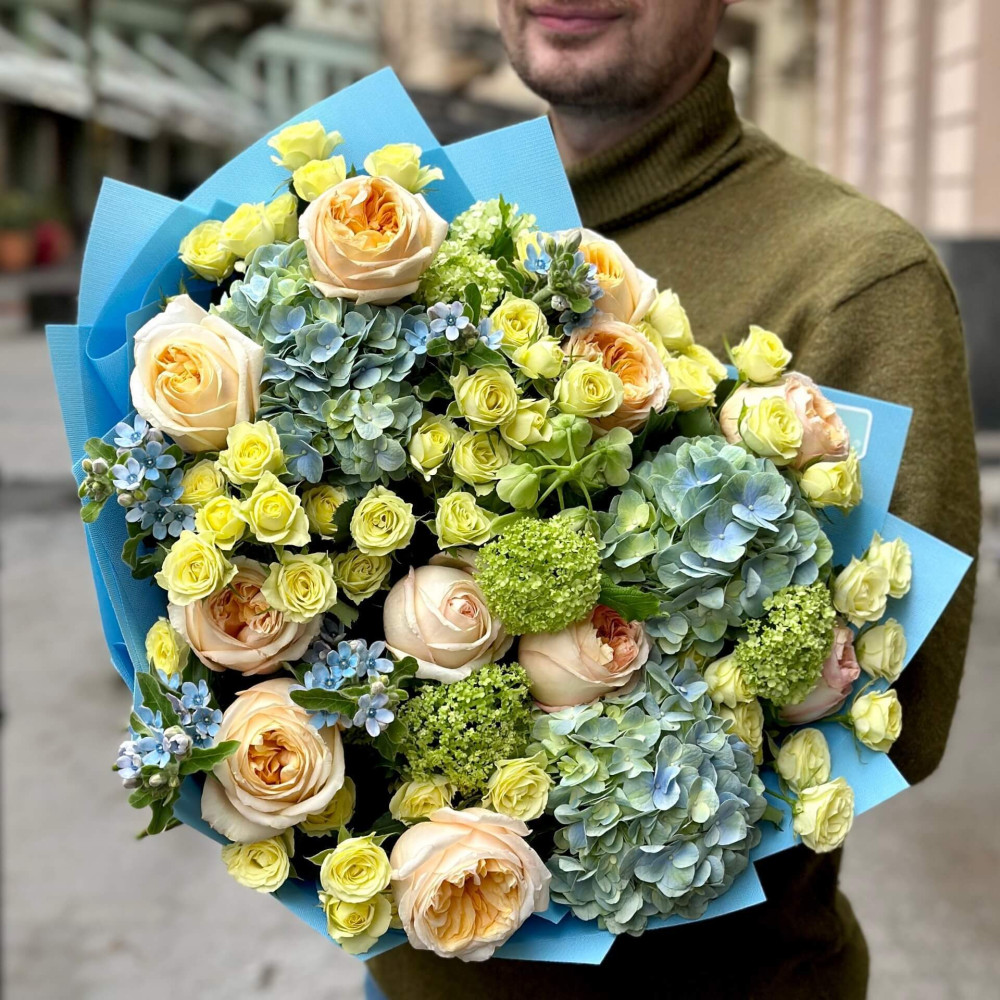 Перші кольори після монохромної зими – весняне небо, лагідне сонце. Блакитна гортензія, жовті кущові троянди, кремові півонієподібні троянди та зірочки синього оксіпеталуму подарують тобі світлі моменти та емоції.