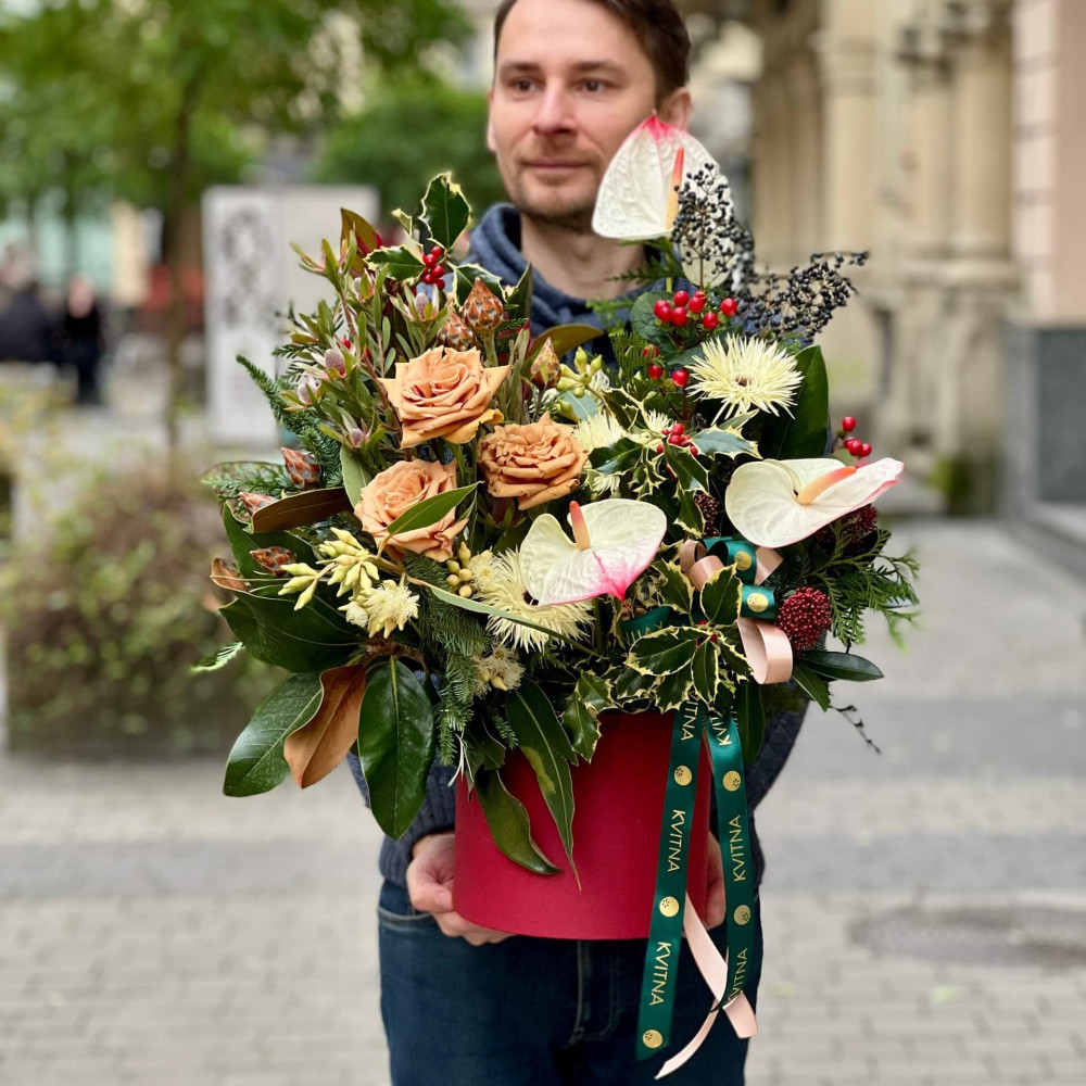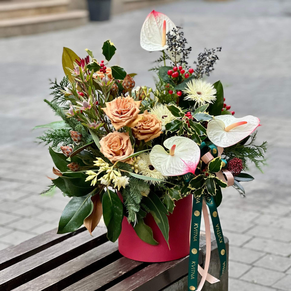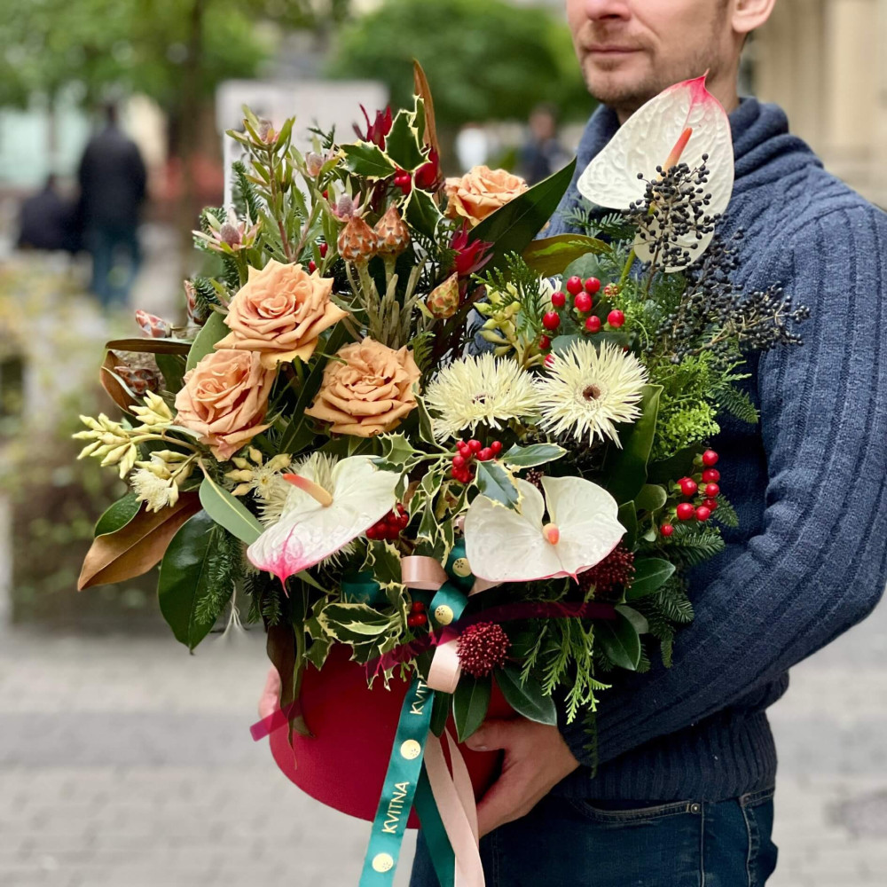 Квіти: Магнолія, Гербера, Троянда піоновидна Toffee, Ілекс, Леукадендрон, Хіперикум, Антуріум, Евкаліпт, Діантус (Гвоздика), Вібурнум (ягоди), Туя