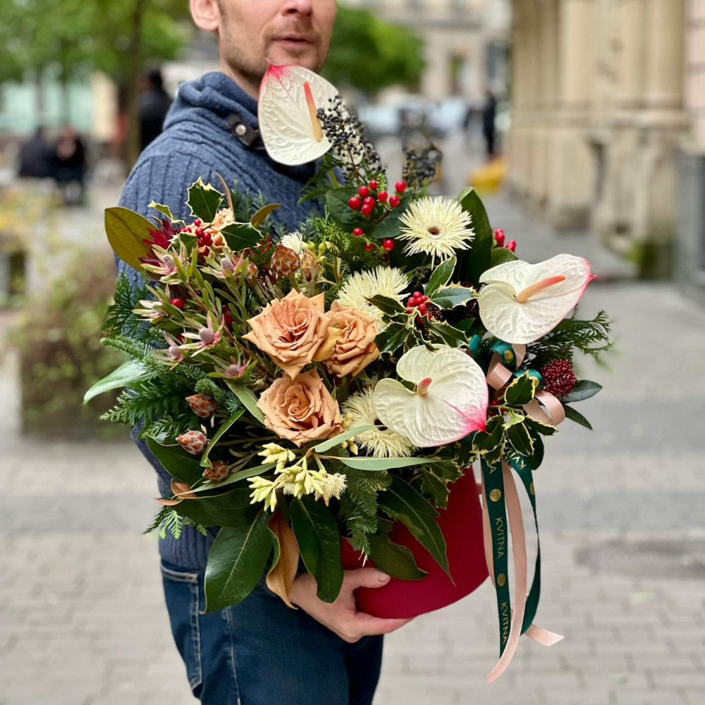Нехай композиція (коробка, кошик, сніп) з квітами від Квітна тішить Вас якнайдовше!
