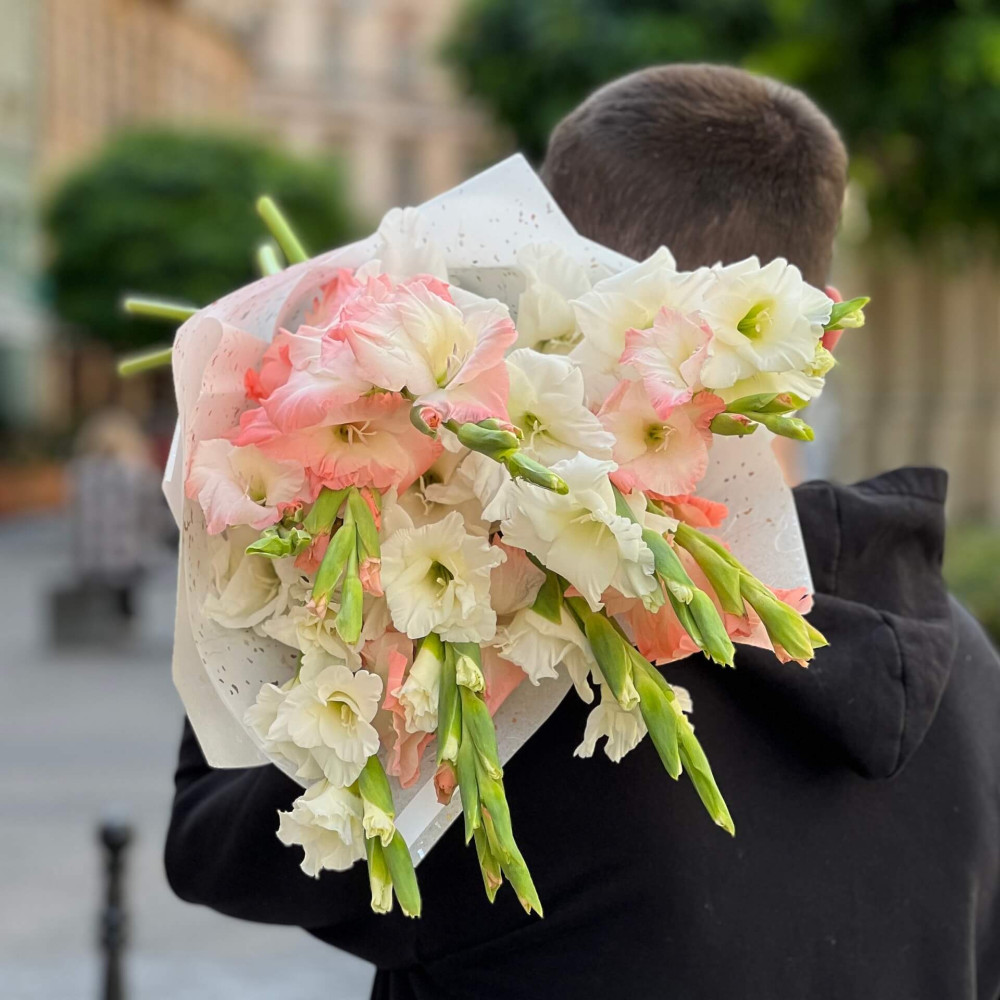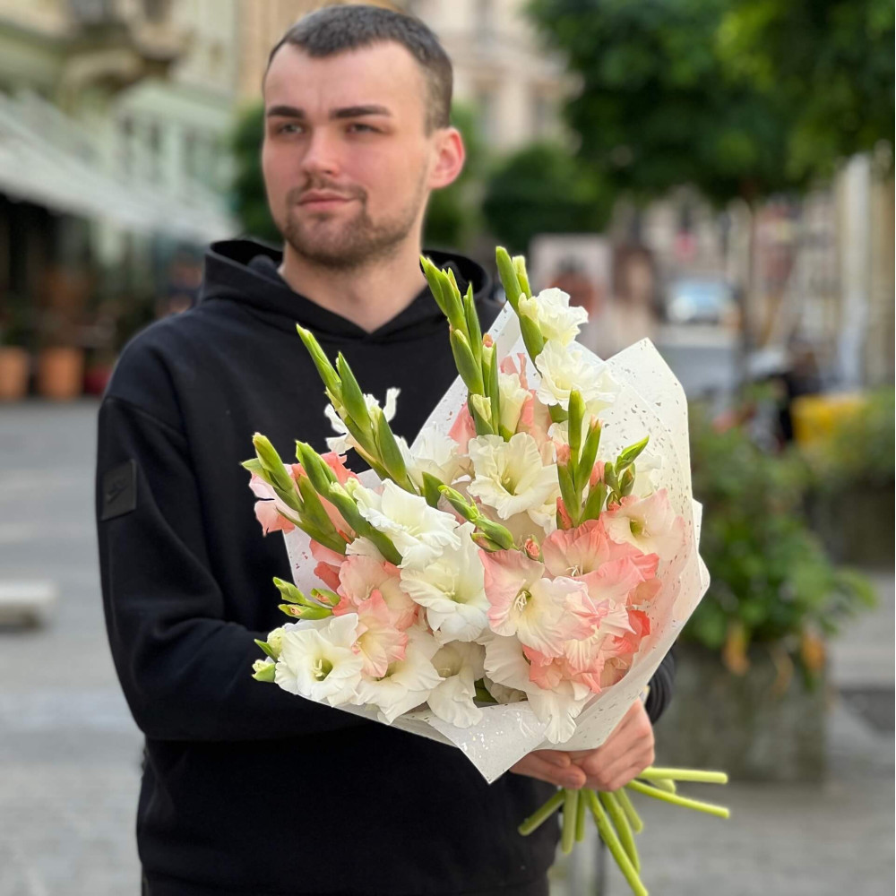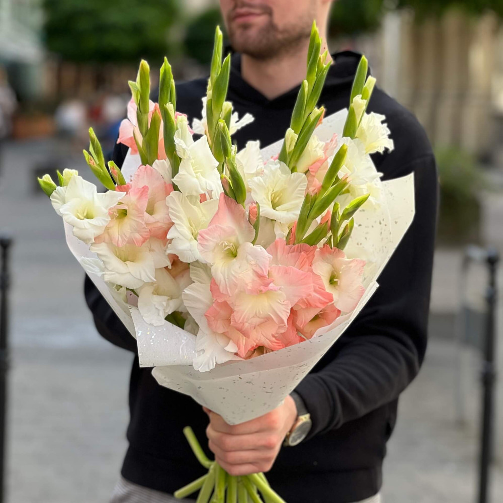 - Как заказать 11 светлых гладиолусов в букете «Танцующие лучи»? ❯