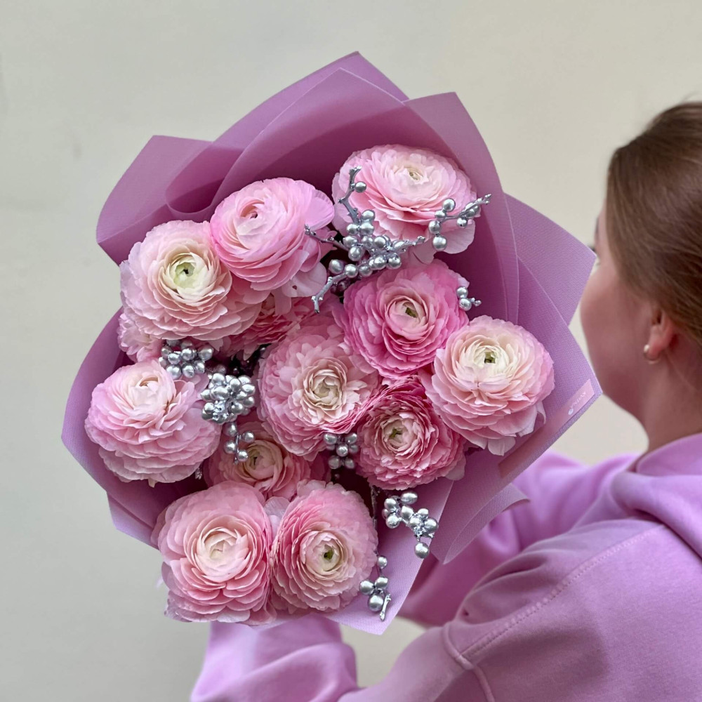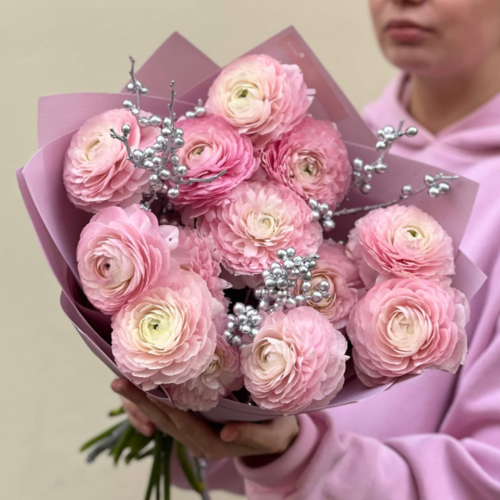 - Как заказать 13 розовых ранункулюсов Clooney Favola и серебряный илекс в букете «Нежная Анна»? ❯