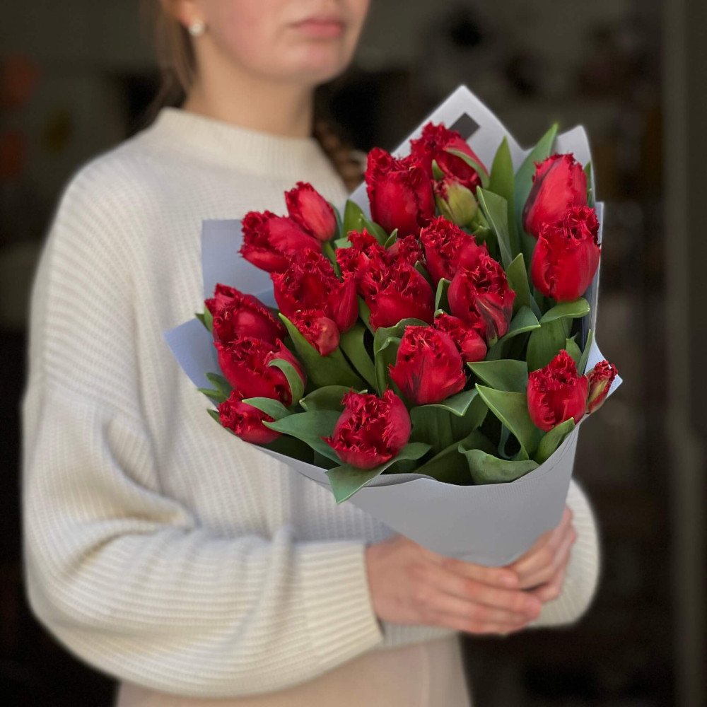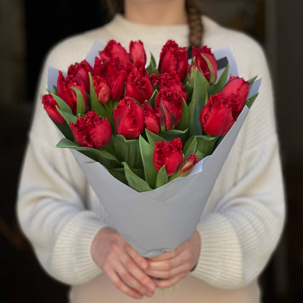 FAQ по 15 бахромчатых тюльпанов Red Wing в букете «Пламенное перо»