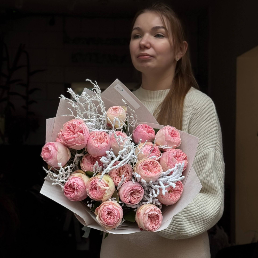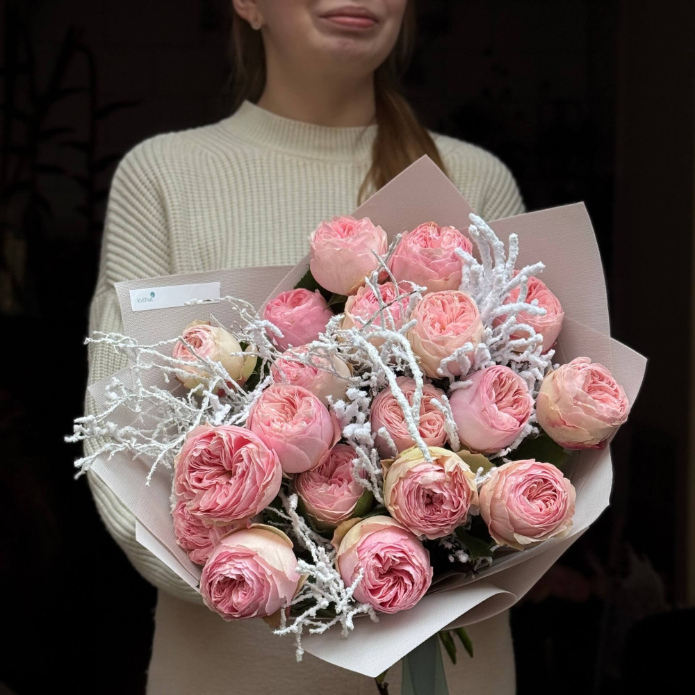 - Как заказать 19 чарующих пионовидных роз сорта Mansfield Park в букете «Снежная весна»? ❯