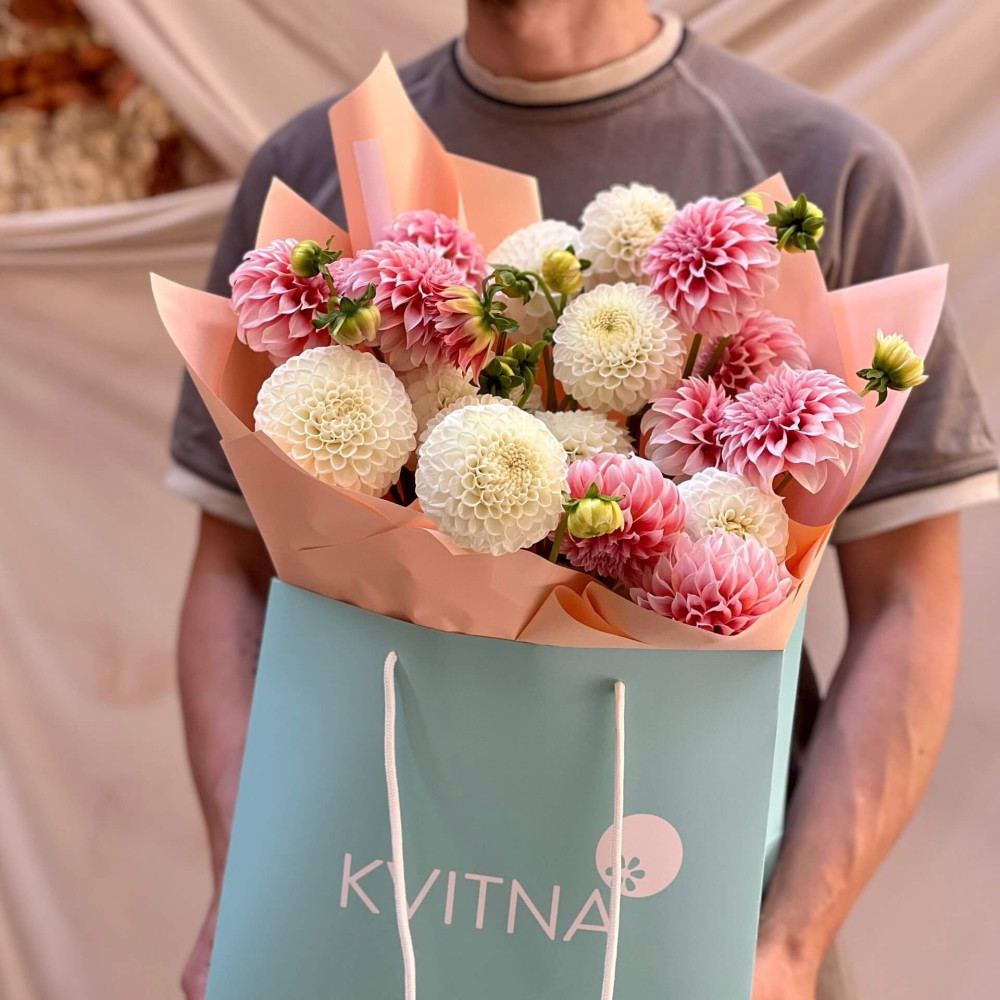 - Букеты от Kvitna доставляются в фирменной упаковке, которую нужно снять при установке цветов в вазу. Не срезайте ленту, связывающую букет, чтобы сохранить форму.