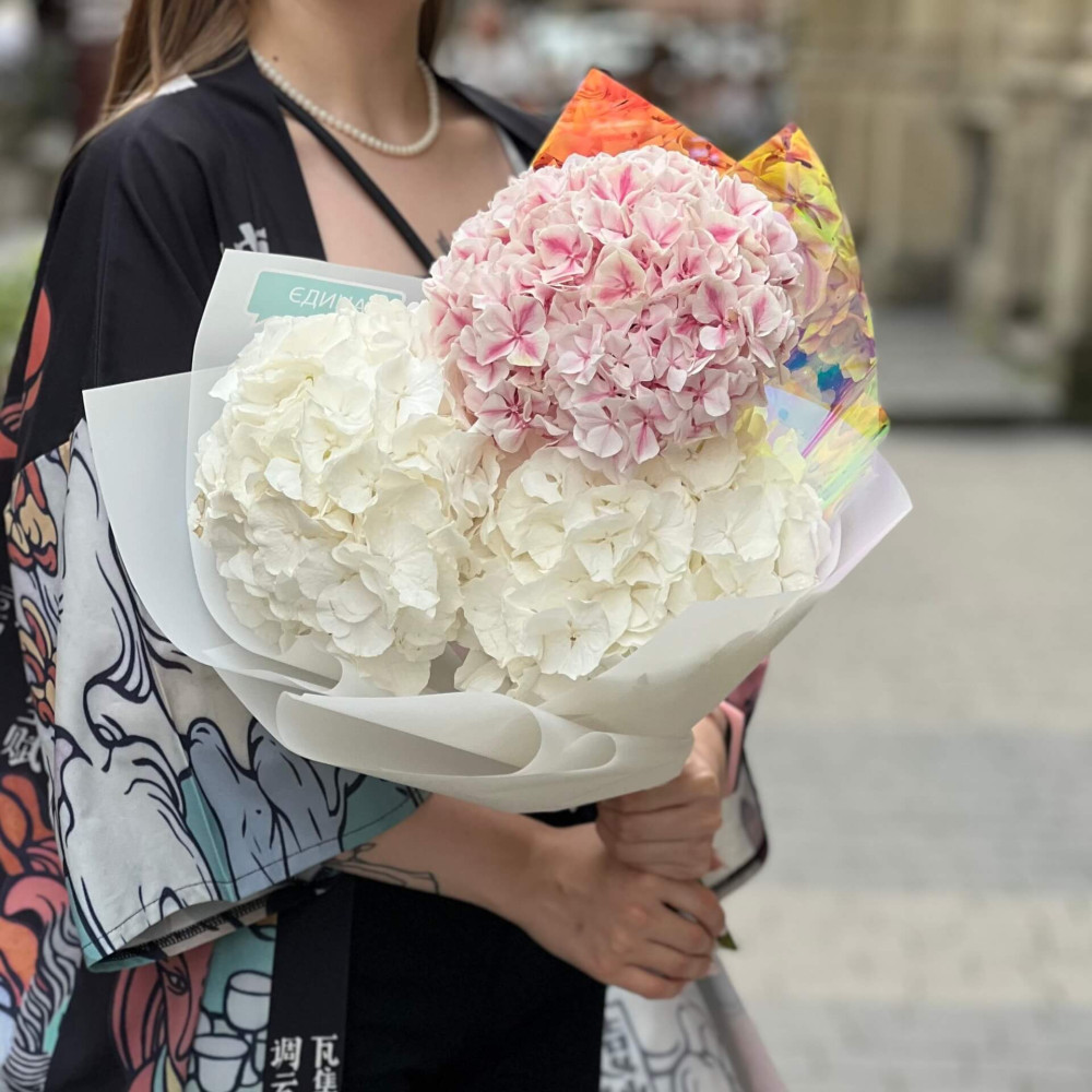 - Как заказать 3 бело-розовые гортензии в букете «Малиновый марципан»? ❯
