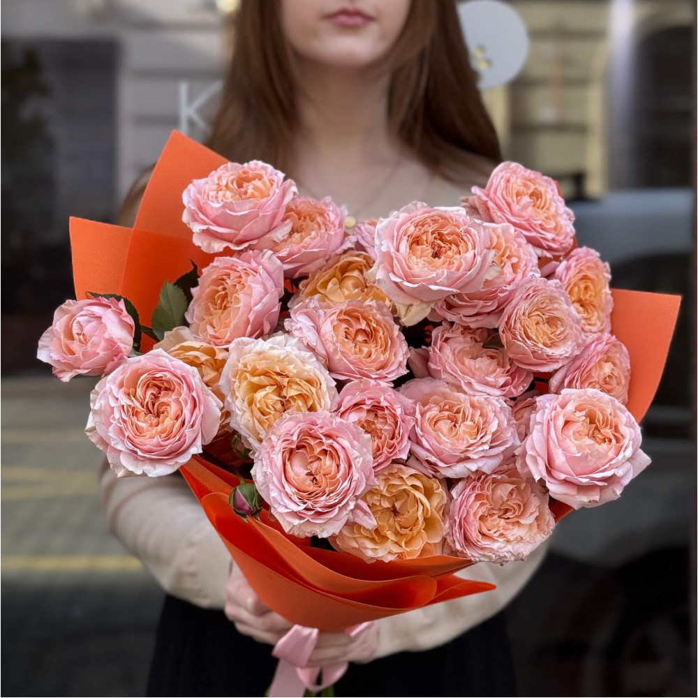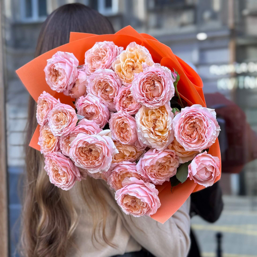 - Как заказать 5 гілок кущової піоновидної троянди Juliet у букеті «Соковитий апельсин»? ❯