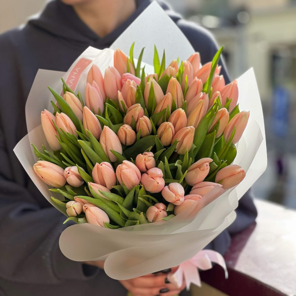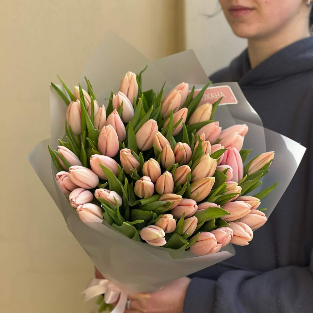 - Как заказать 51 премиальный лососевый тюльпан в букете «Нежный»? ❯