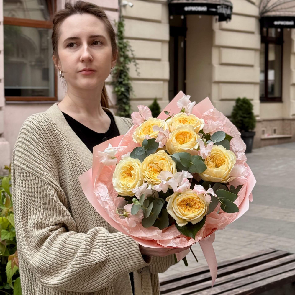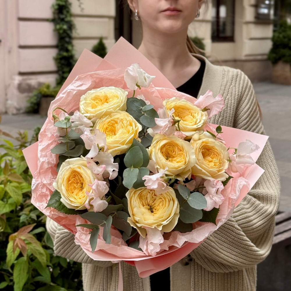 Цветы: Роза пионовидная Persuasion - 7 шт., Эвкалипт, Латирус